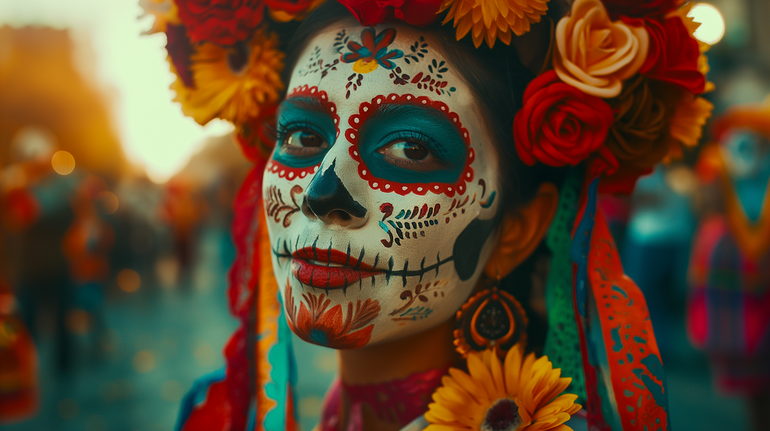 Woman with Dia de los Muertos face paint and floral crown, celebrating in a vibrant, festive setting.