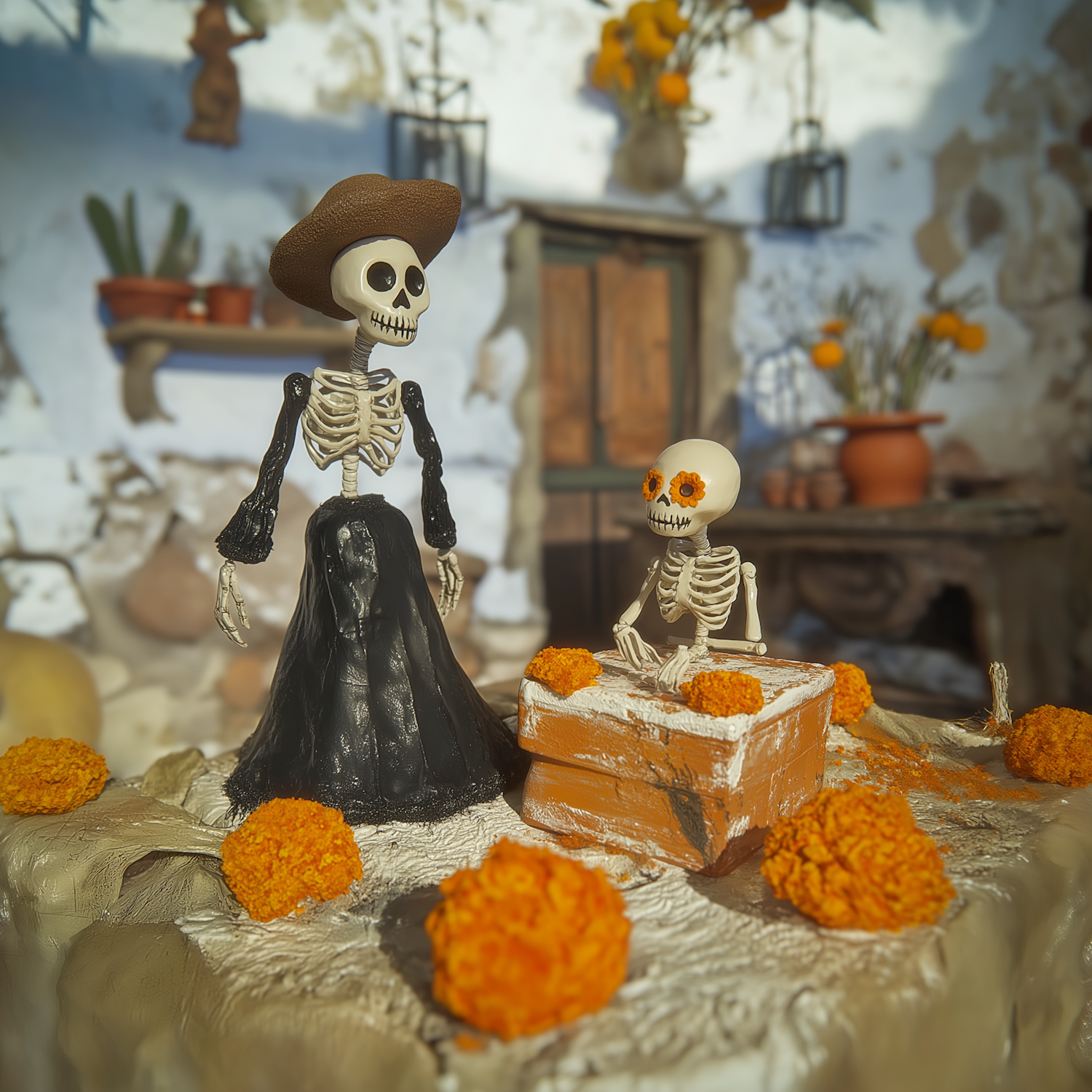Skeleton figures in festive attire with marigold flowers, celebrating in a rustic setting, evoking Dia de los Muertos vibes.