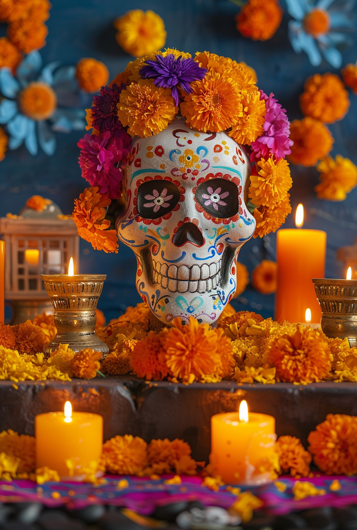 Colorful Day of the Dead altar with a painted sugar skull, marigold flowers, and lit candles, creating a vibrant and sacred atmosphere.