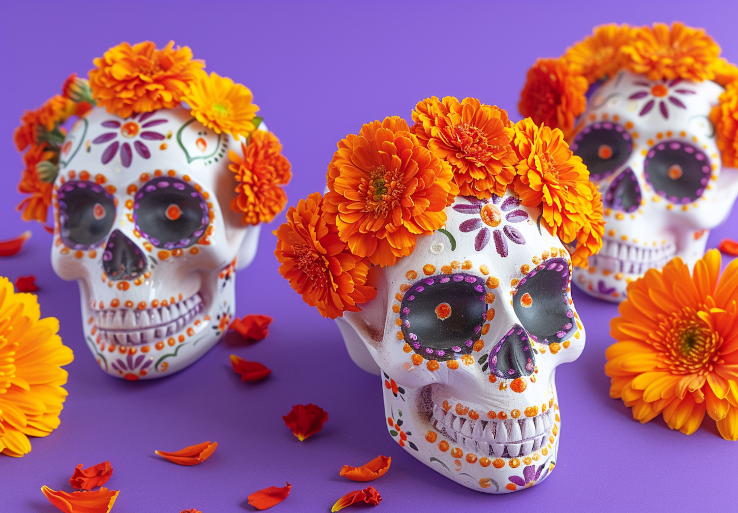 Vibrant Day of the Dead sugar skulls with marigold crowns on a purple background, showcasing colorful patterns and festive decor.