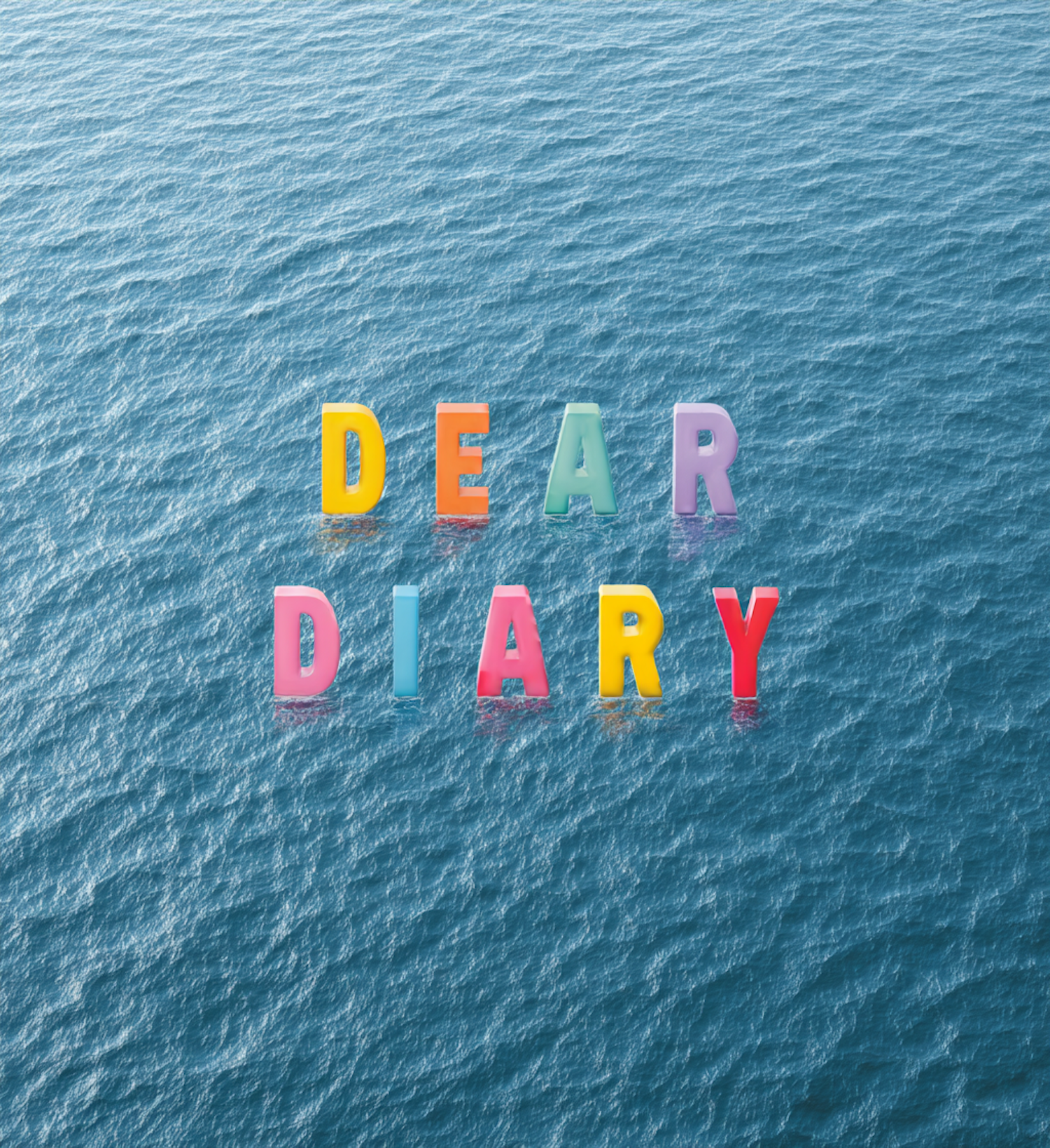 Colorful 3D letters spelling 'DEAR DIARY' float on a calm blue ocean, creating a serene and creative visual scene.