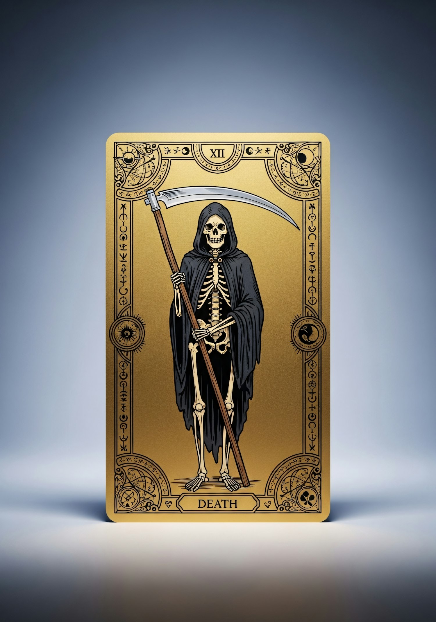 A detailed illustration of the Death tarot card, featuring a skeletal figure with a scythe, surrounded by intricate golden designs.