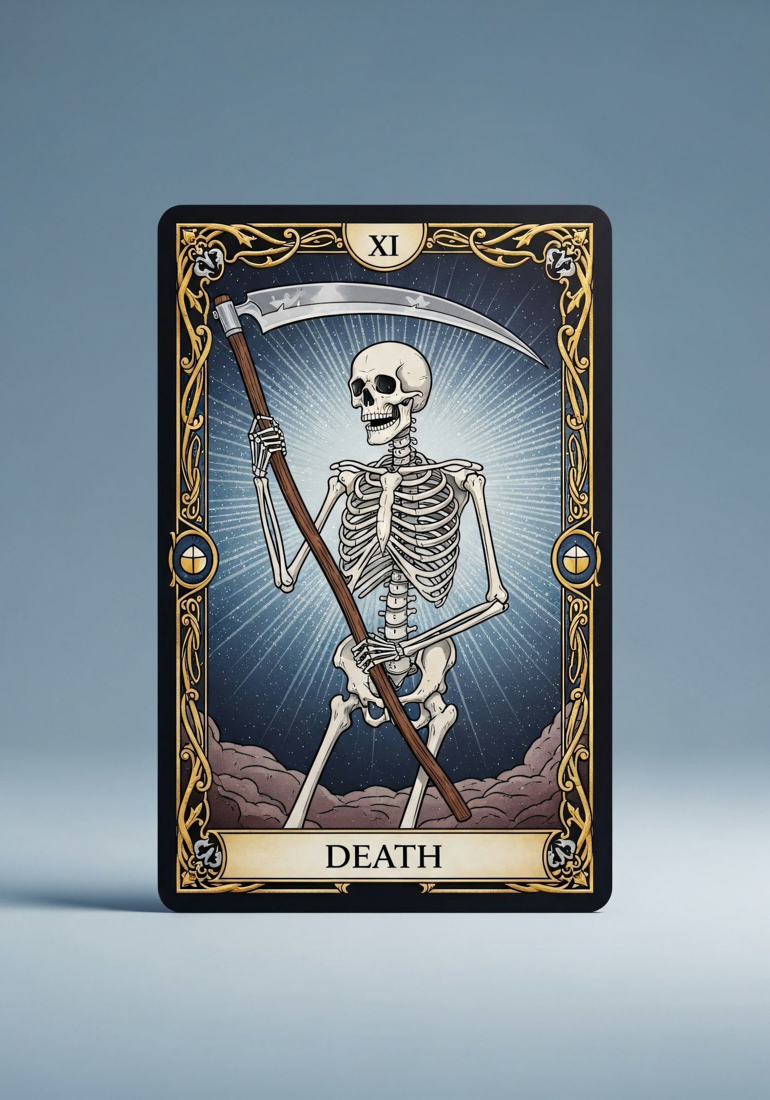 A detailed illustration of the Death tarot card, featuring a skeleton with a scythe, ornate golden borders, and a radiant background.
