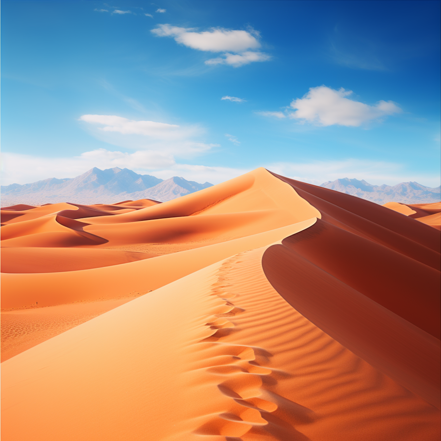 Golden sand dunes under a vibrant blue sky with mountains in the distance and footprints leading up the dune.