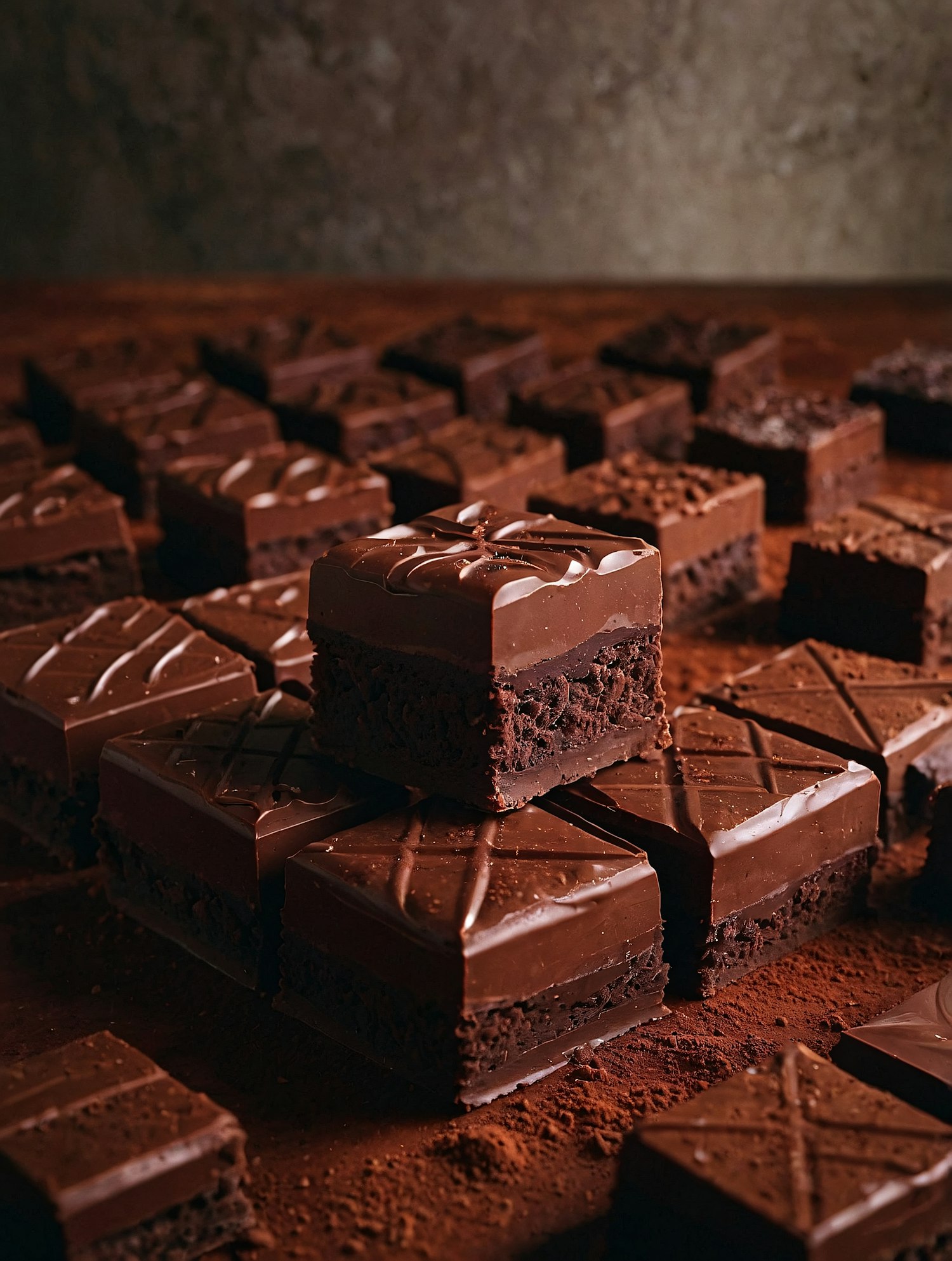 Decadent chocolate brownies with glossy ganache topping, arranged on a cocoa-dusted surface. Perfect for dessert lovers!