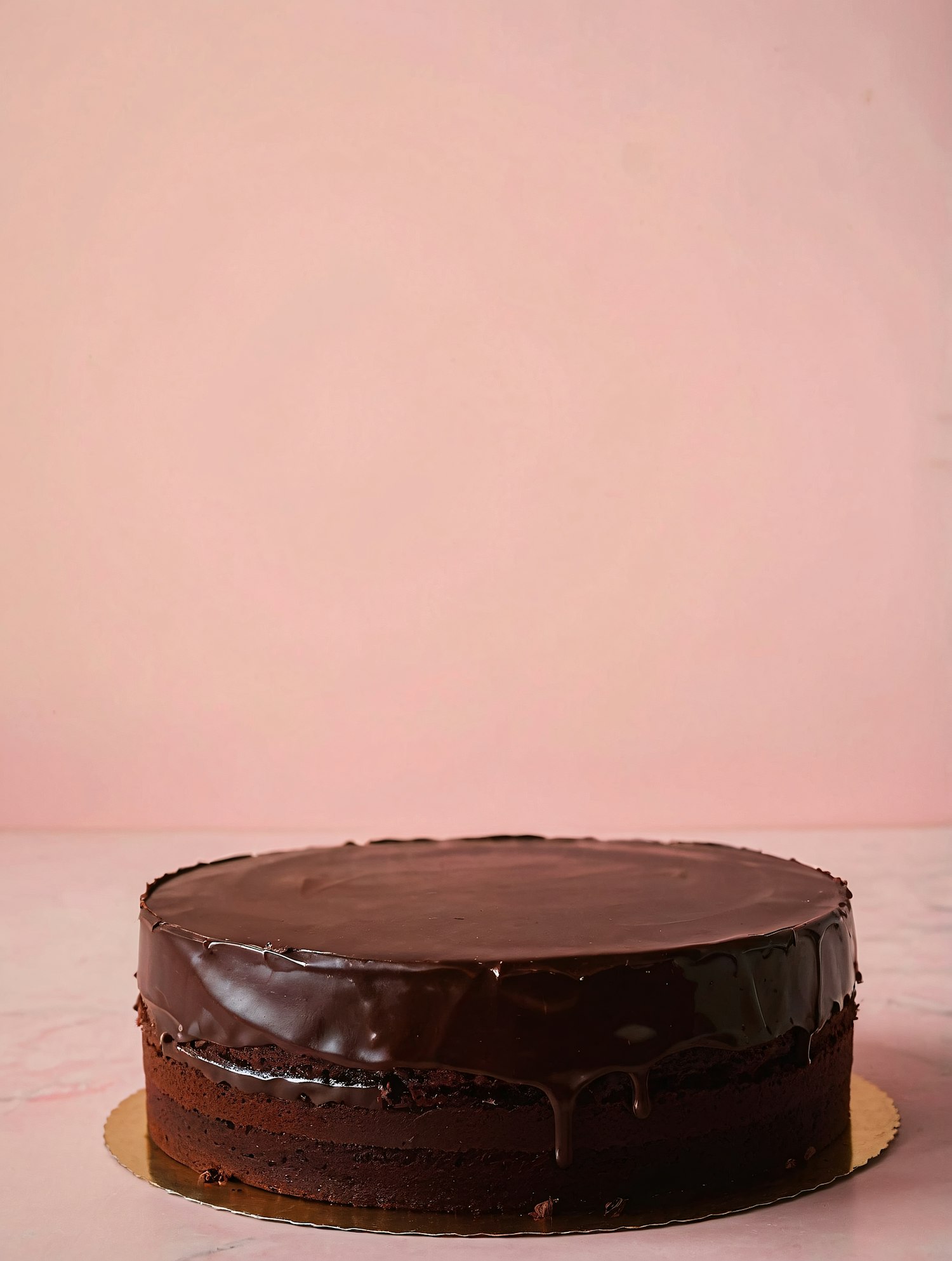 Decadent chocolate cake with glossy ganache layers and a smooth glaze, set against a soft pink background. Perfect for dessert lovers!