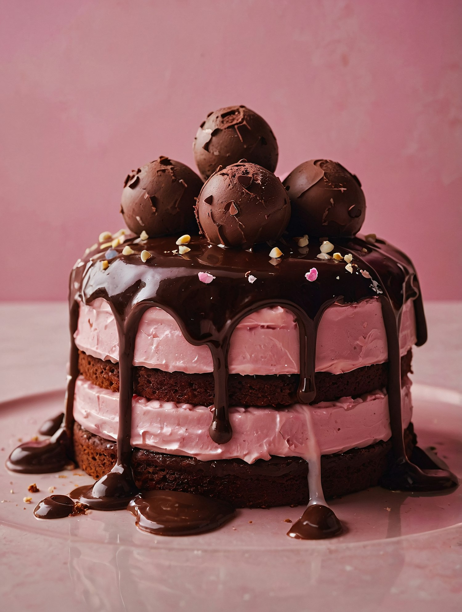 Indulge in this rich chocolate cake with pink frosting, glossy ganache, and truffle topping. Perfect for celebrations or a sweet treat!