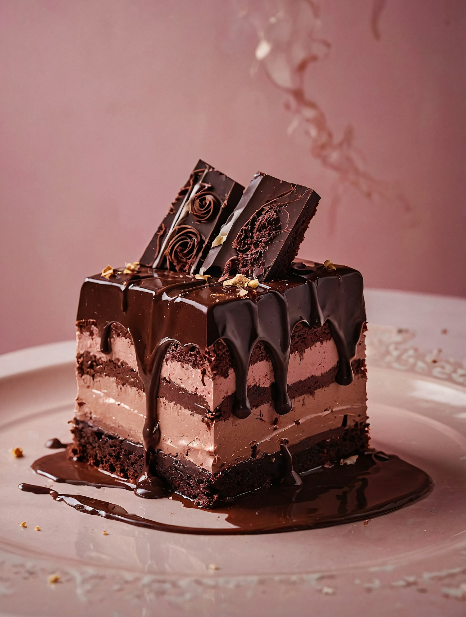 Indulge in this rich chocolate cake with layers of mousse, ganache, and decorative chocolate shards. Perfect for dessert lovers!