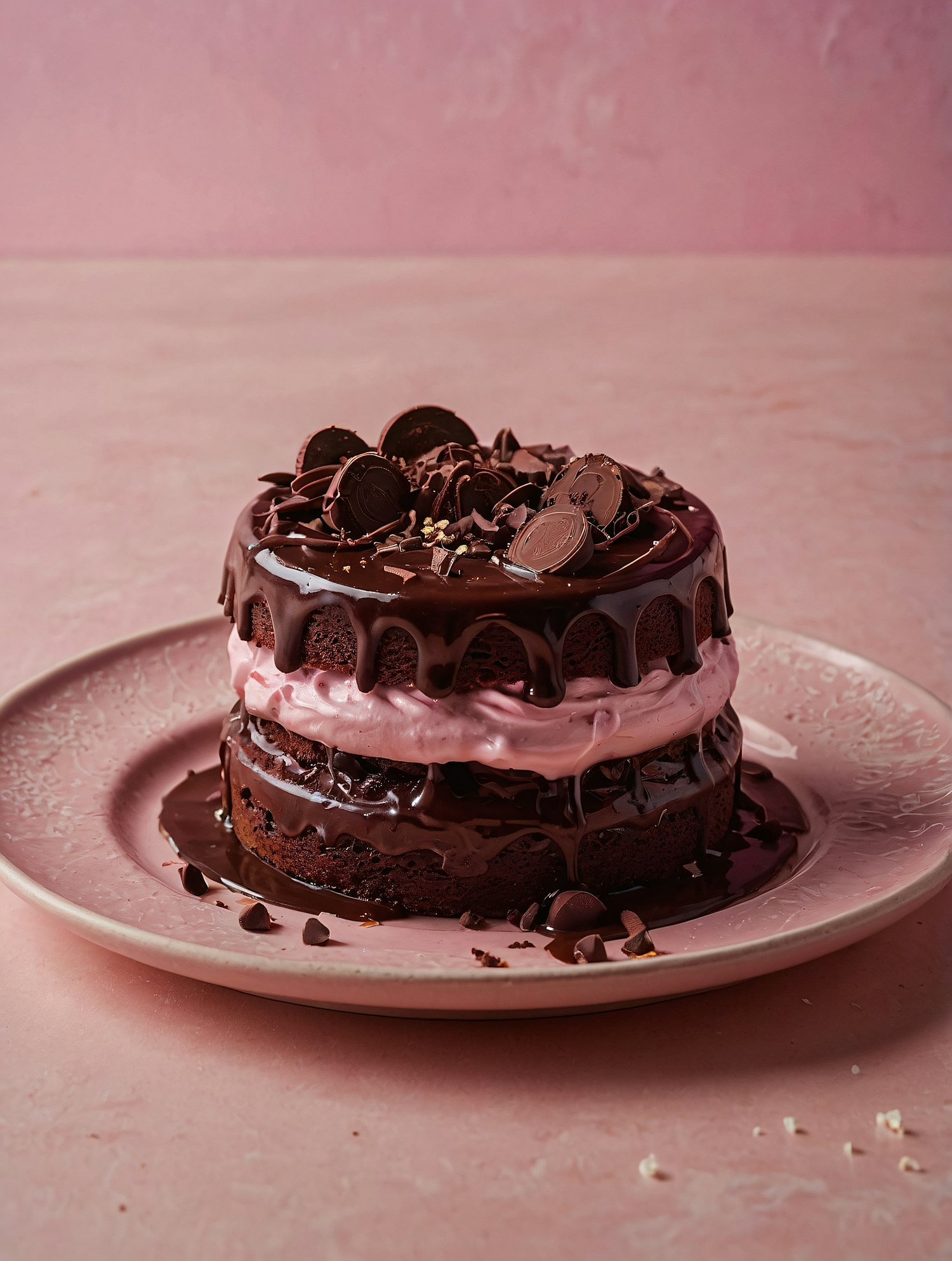 Decadent chocolate cake with pink frosting, chocolate ganache, and toppings on a pink plate. Perfect for dessert lovers!