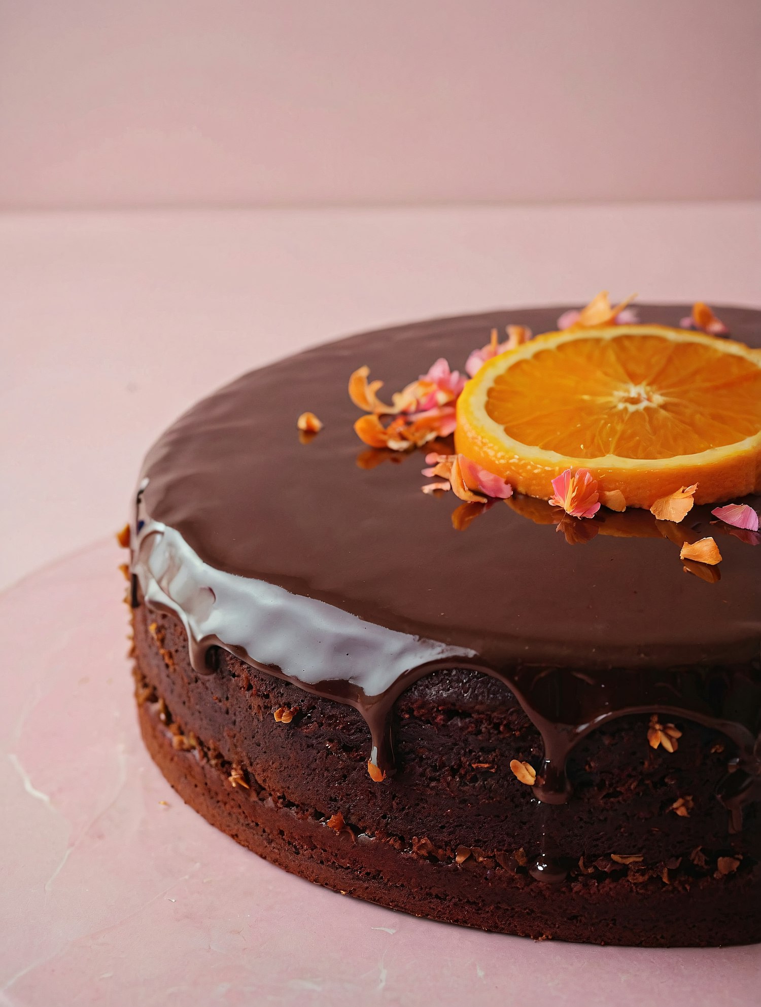 Rich chocolate cake with ganache glaze, topped with an orange slice and edible petals on a soft pink background.