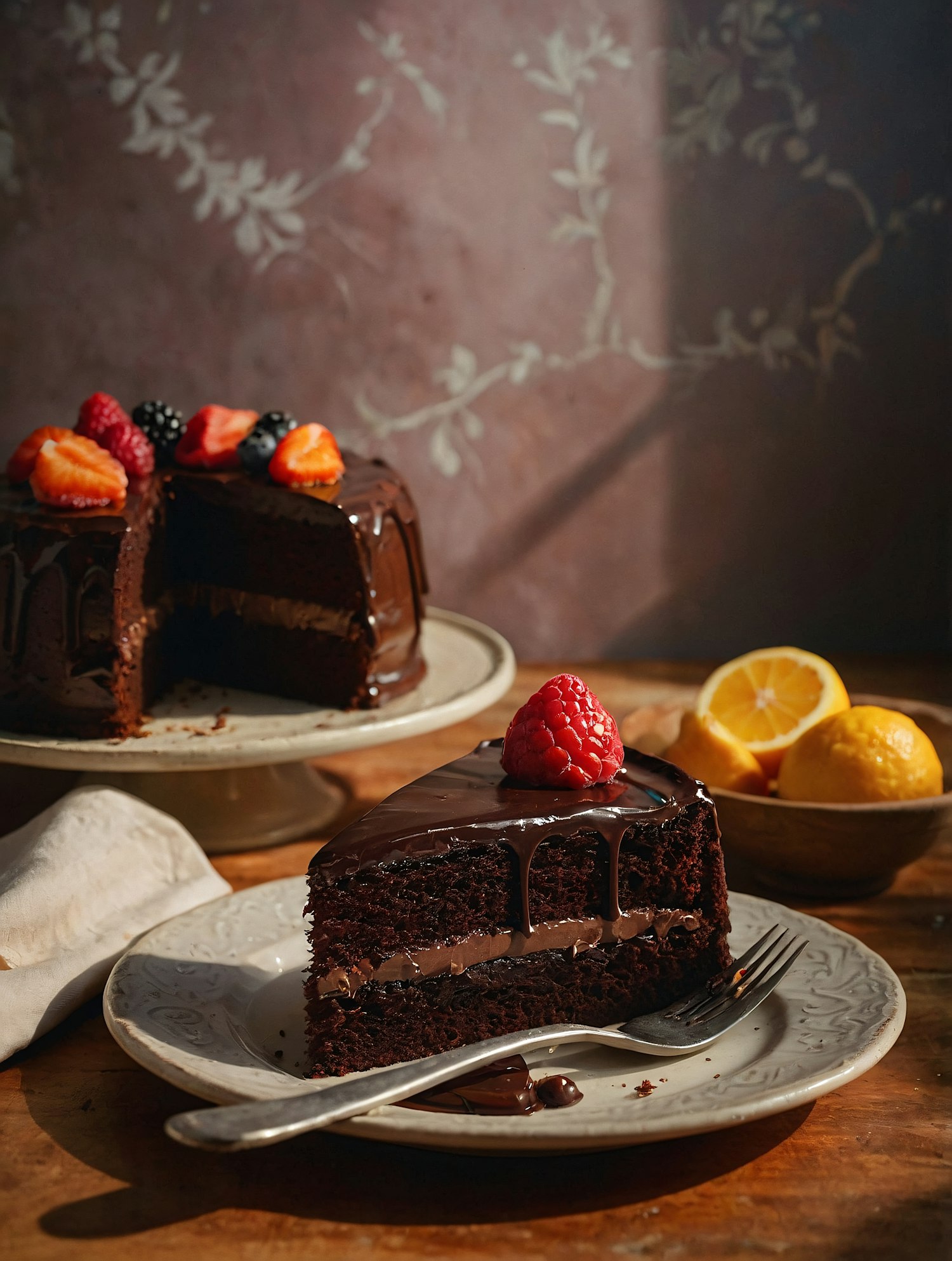Rich chocolate cake slice with ganache, glossy glaze, and fresh raspberry on a rustic table. Perfect for dessert lovers!