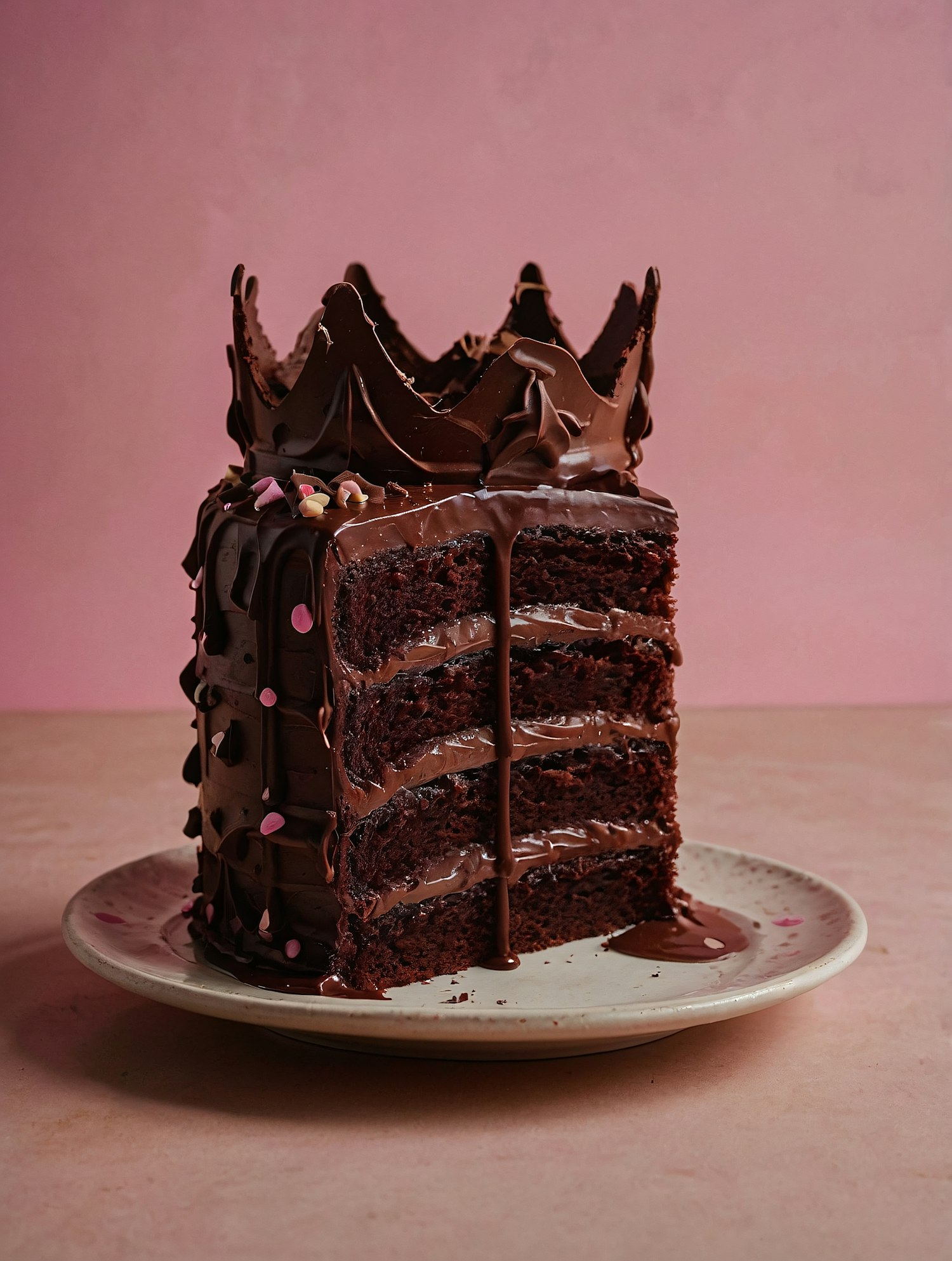 Indulge in this rich chocolate cake slice with layers of frosting, a chocolate crown, and ganache drips, set against a soft pink backdrop.