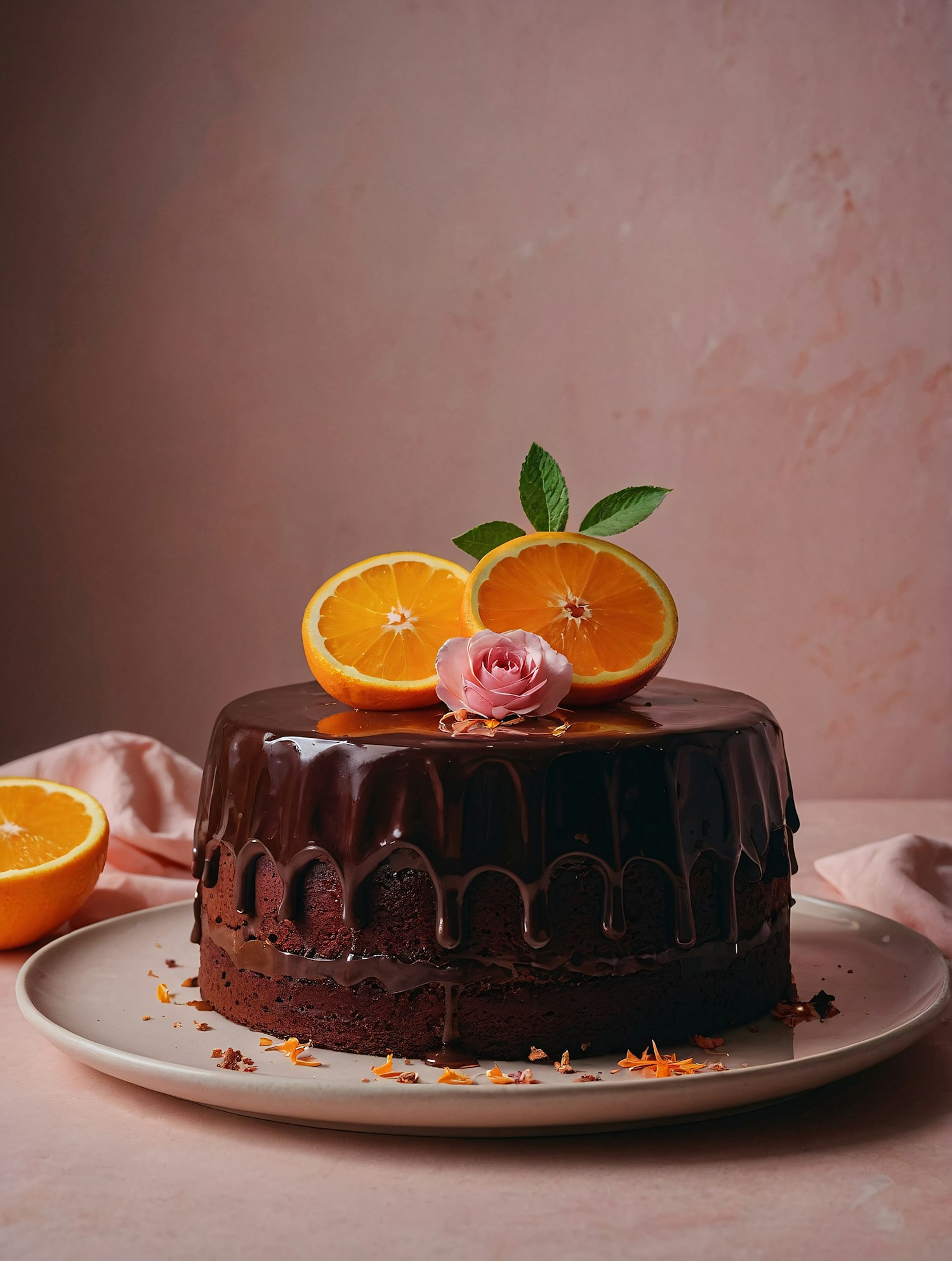 Rich chocolate cake with glossy ganache, topped with orange slices, a pink rose, and mint leaves. Perfect for dessert lovers!