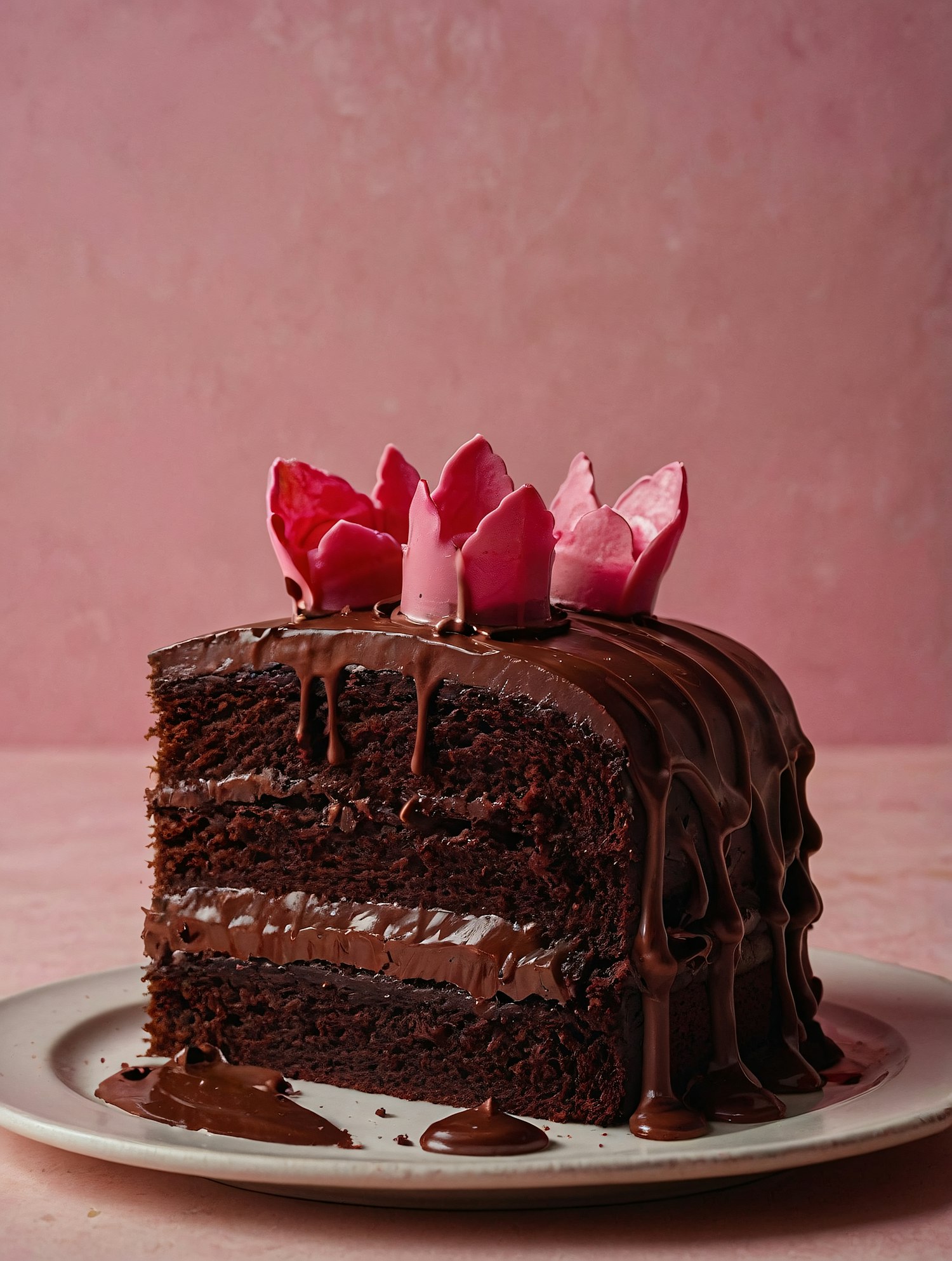 Rich chocolate cake slice with ganache and pink petal decorations on a white plate, set against a soft pink background.