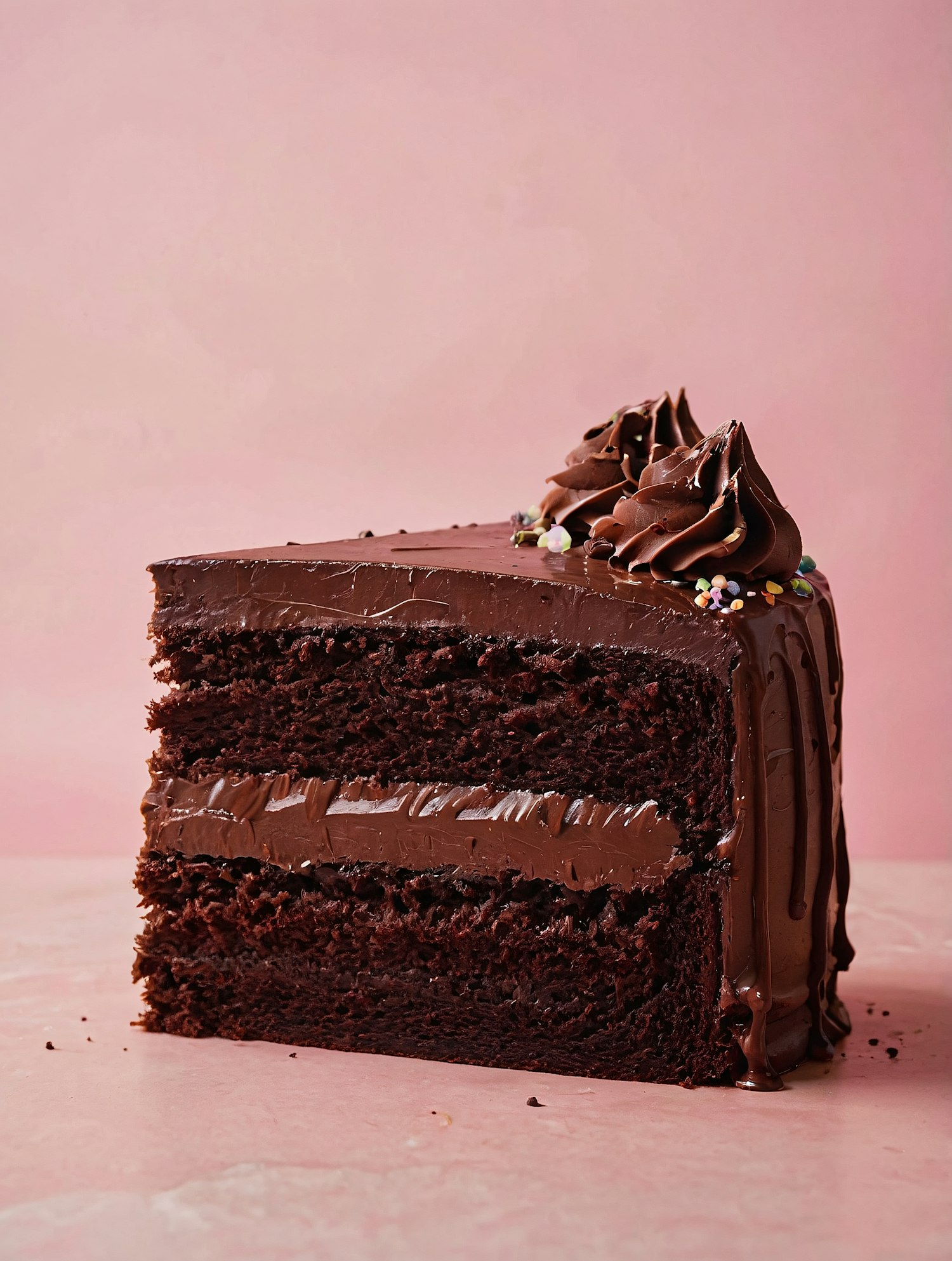 A rich chocolate cake slice with creamy frosting, ganache drips, and colorful sprinkles on a pink background. Perfect for dessert lovers!