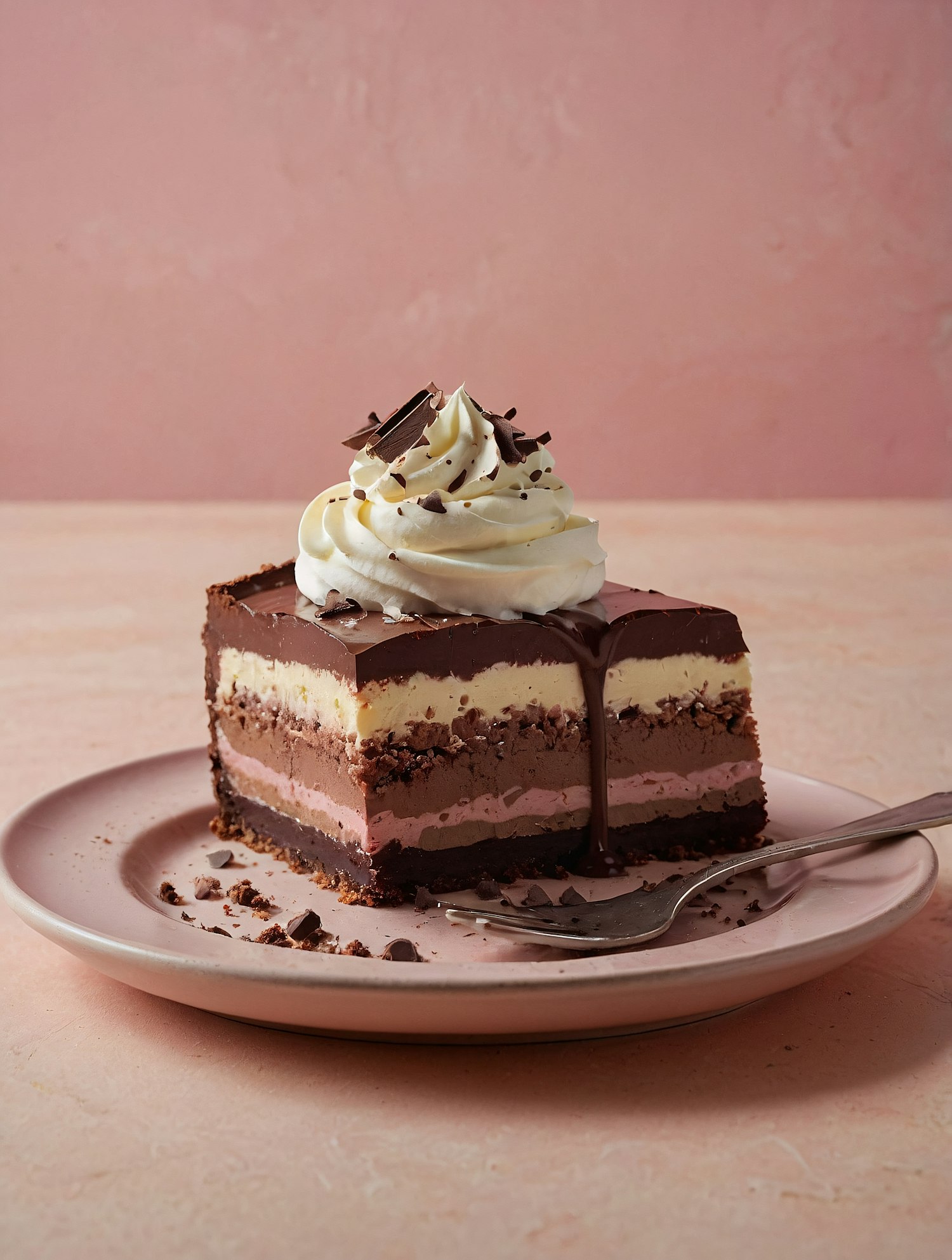 Decadent layered chocolate dessert with whipped cream, chocolate shavings, and ganache drizzle on a pink plate. Perfect for sweet lovers!