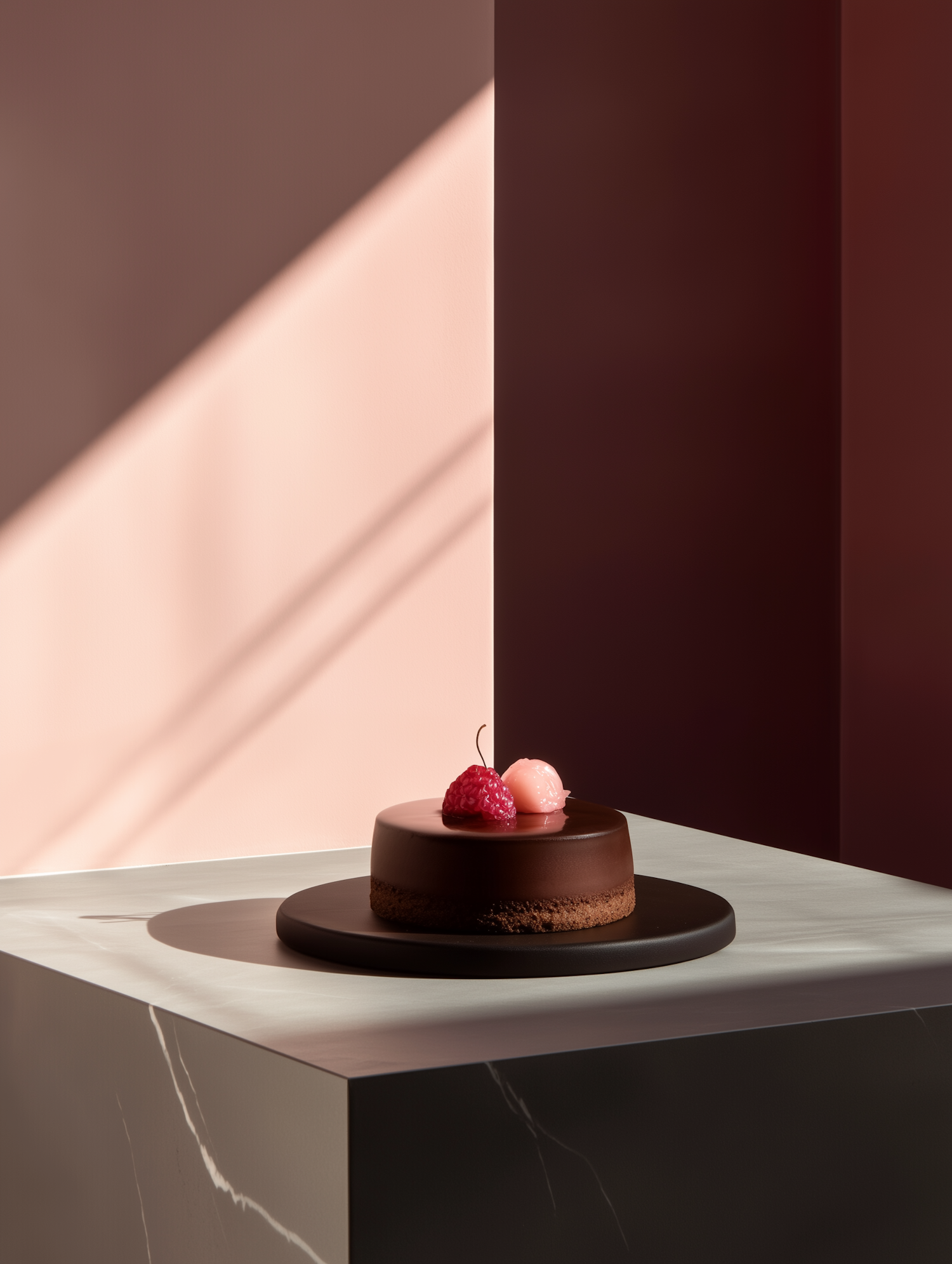 Elegant chocolate dessert with raspberry and lychee topping on a black plate, set against a modern, minimalist background with soft lighting.