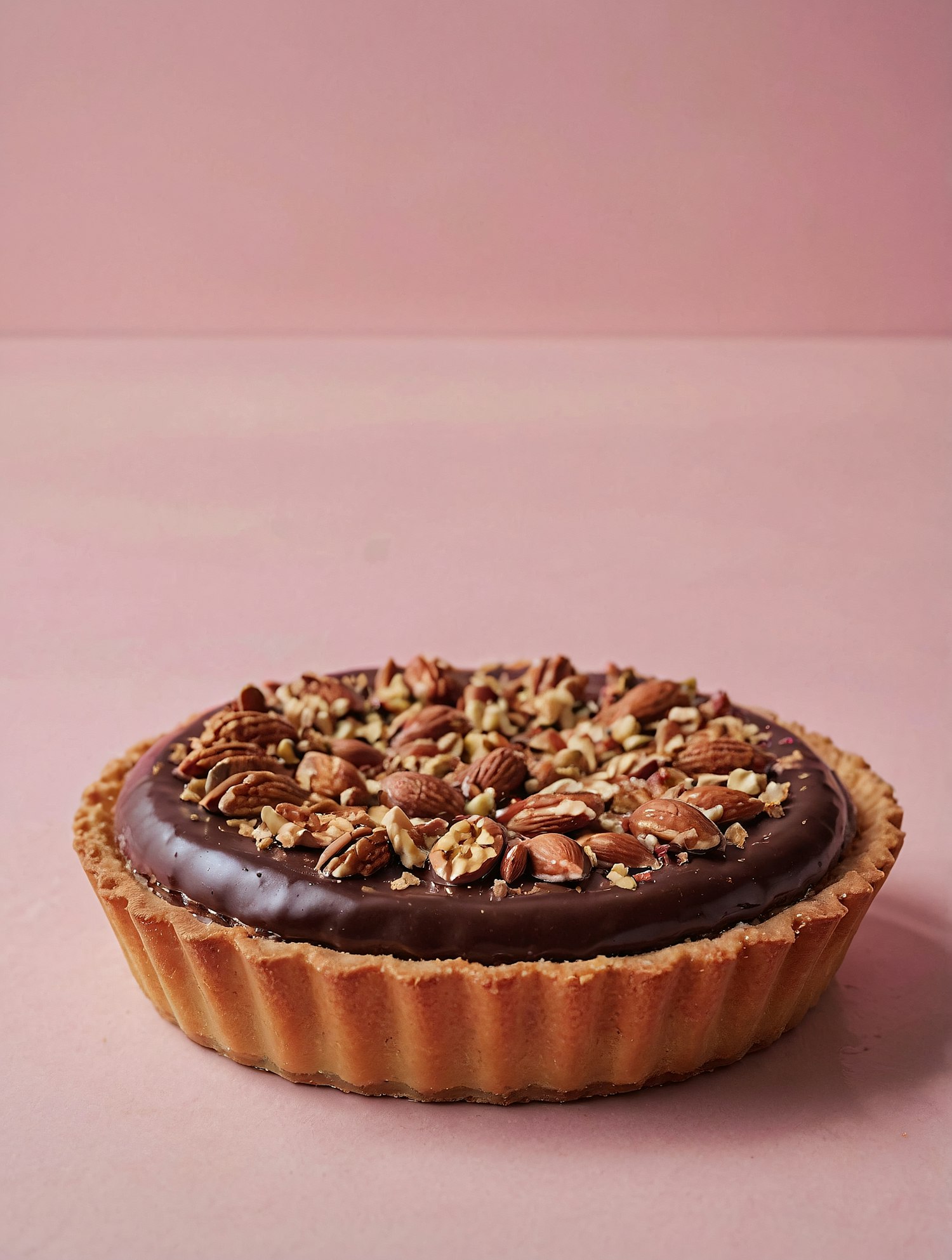 Rich chocolate tart with a golden crust, glossy ganache, and nut topping on a pastel pink background. Perfect for dessert lovers!