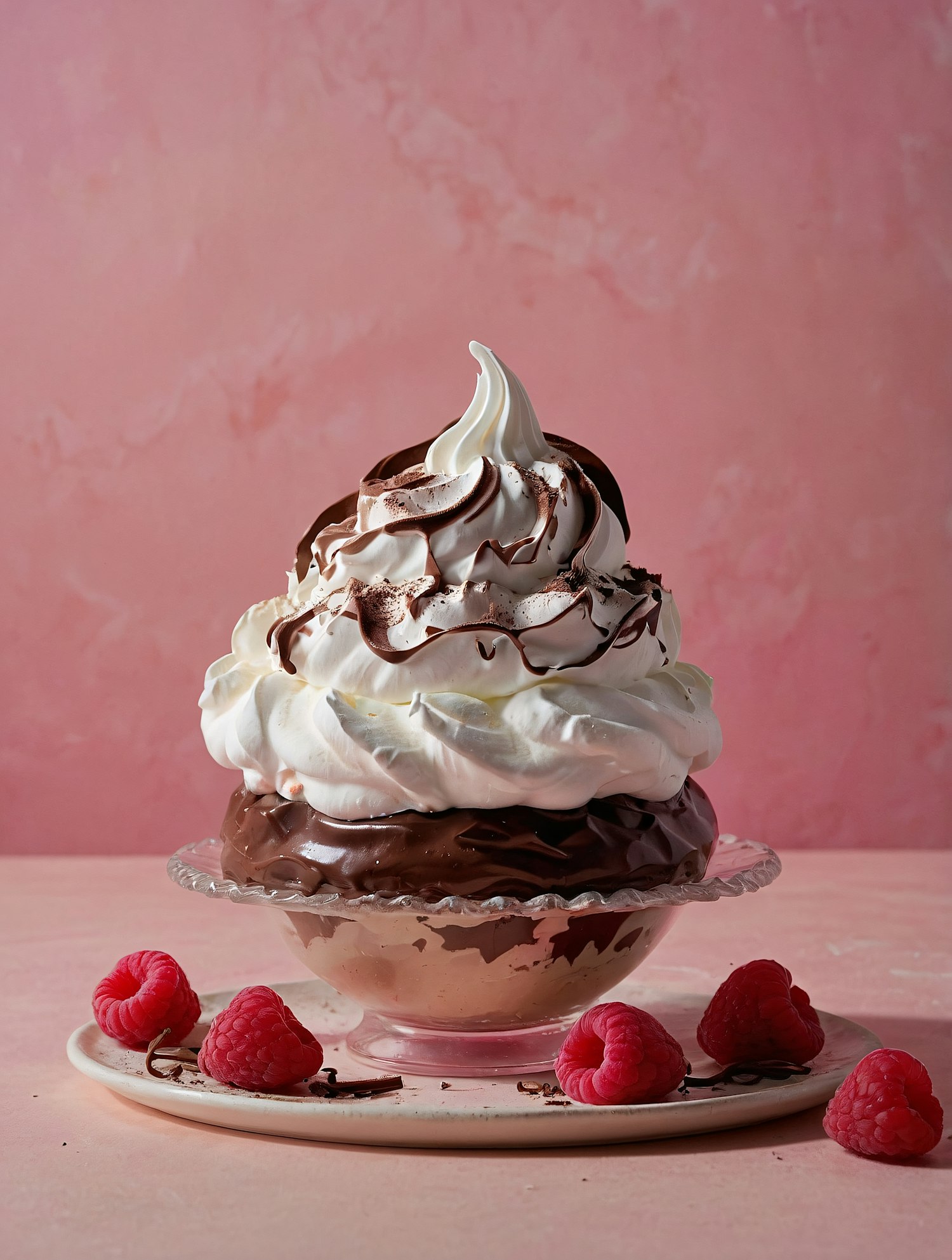 A luscious dessert with whipped cream, chocolate drizzle, and fresh raspberries on a pink backdrop. Perfect for sweet tooth cravings!
