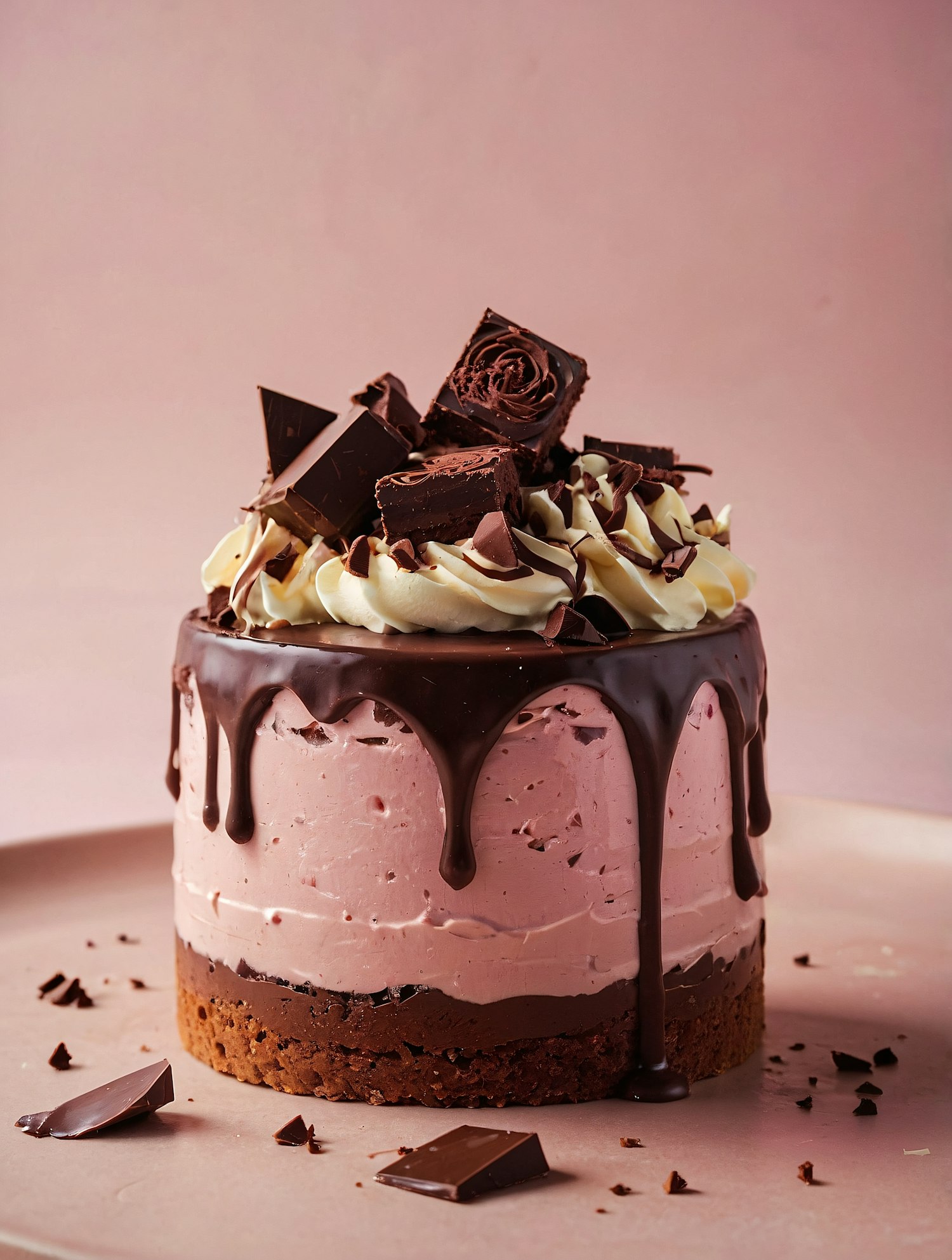 Indulge in this layered dessert with cookie dough, pink frosting, chocolate ganache, and a chocolate drizzle topped with dark chocolate chunks.