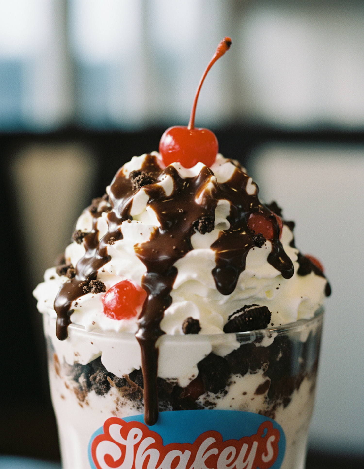 A delicious dessert with whipped cream, chocolate syrup, cookie crumbles, and a cherry on top, served in a branded glass.