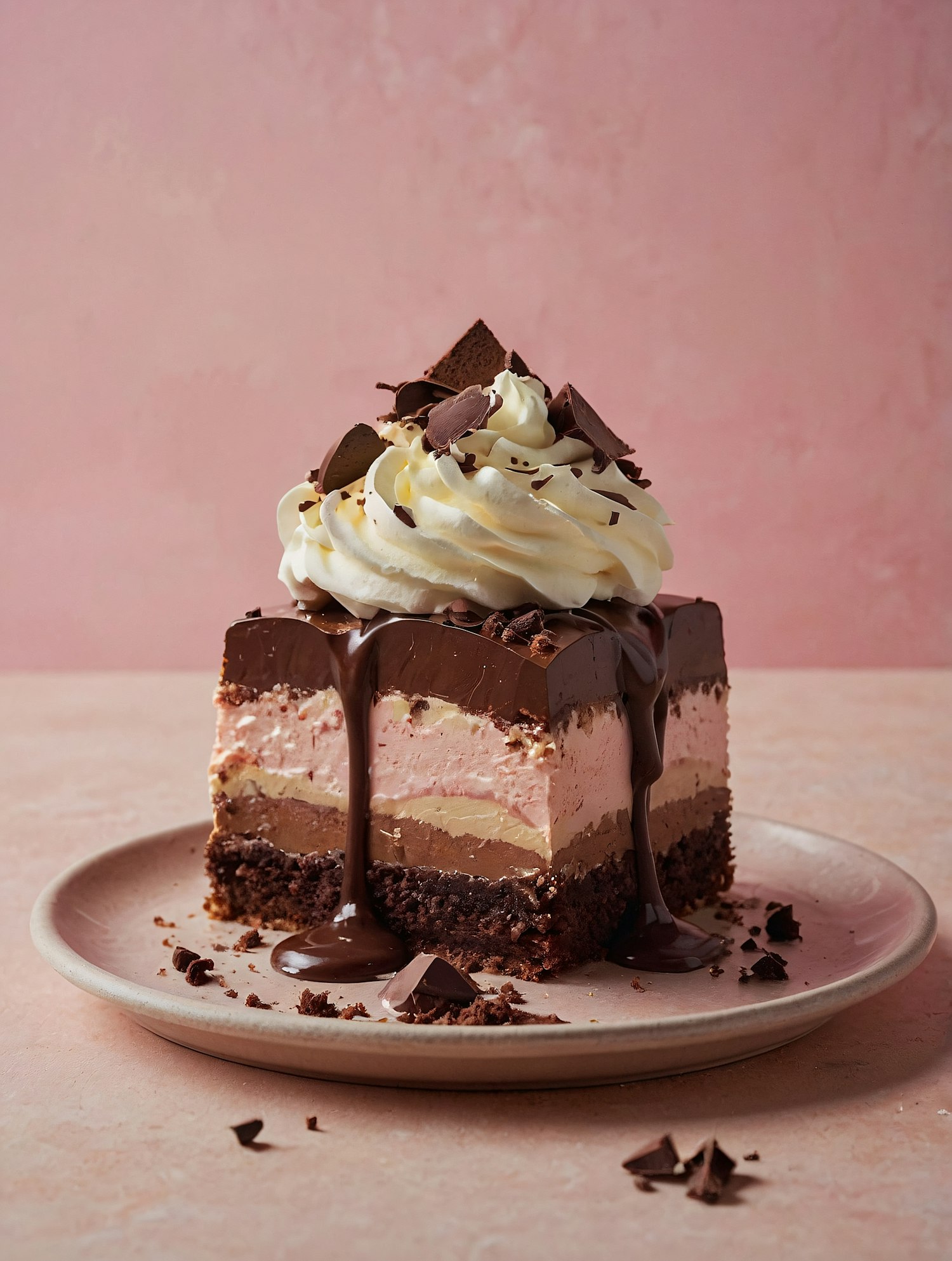 A rich layered dessert with chocolate, vanilla, and strawberry, topped with whipped cream, chocolate shavings, and drizzled with chocolate sauce.