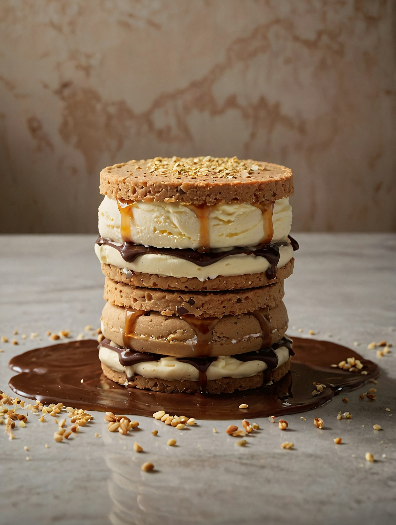 A mouthwatering stack of cookies, ice cream, caramel, and chocolate, topped with crushed nuts. Perfect for dessert lovers!