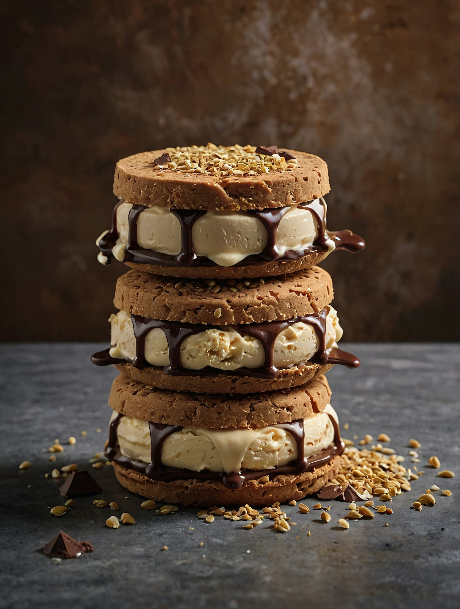 Stack of ice cream sandwiches with cookies, vanilla ice cream, chocolate sauce, and nut toppings on a dark rustic surface.