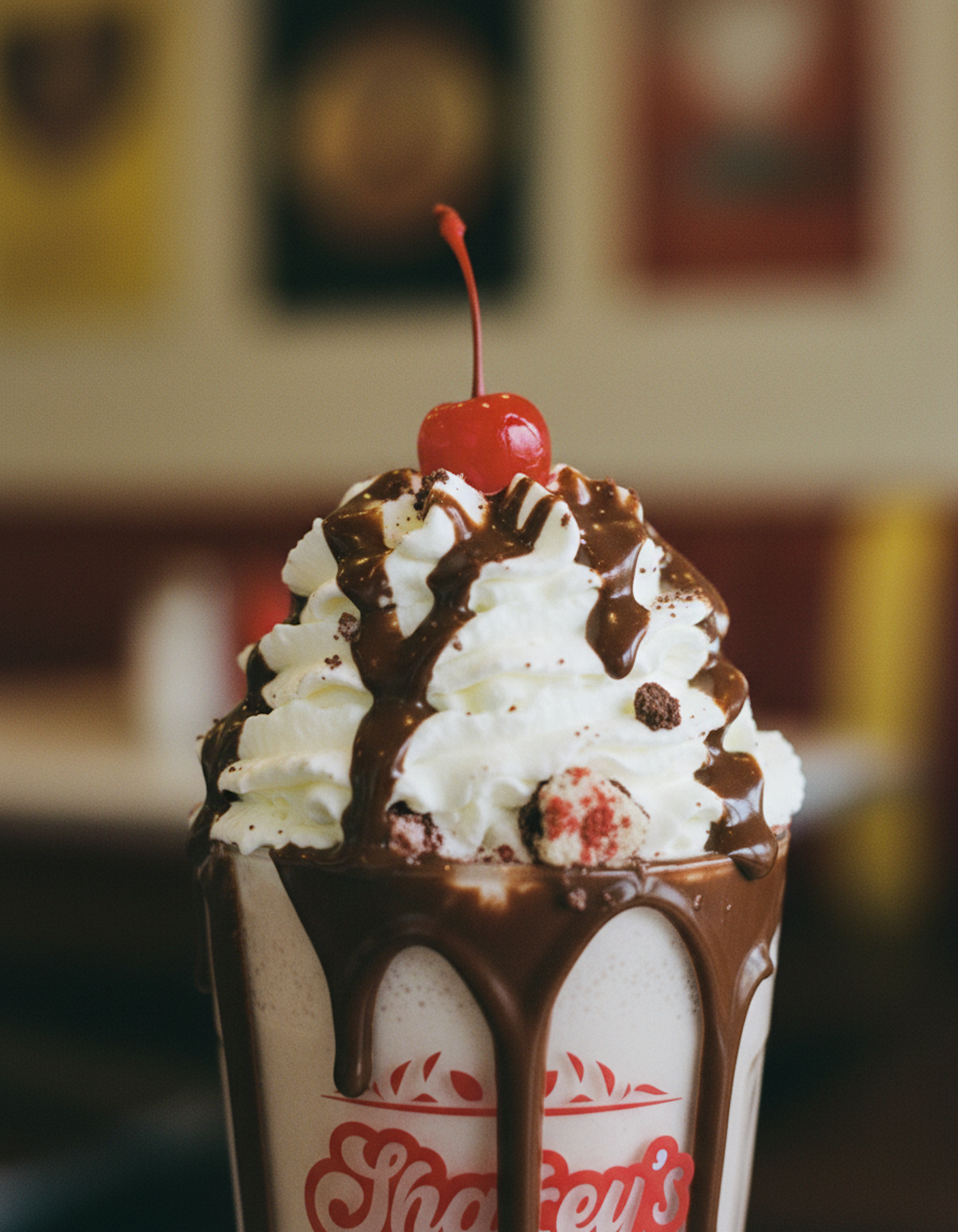 A delicious milkshake topped with whipped cream, chocolate syrup, and a cherry, served in a branded glass in a cozy diner setting.