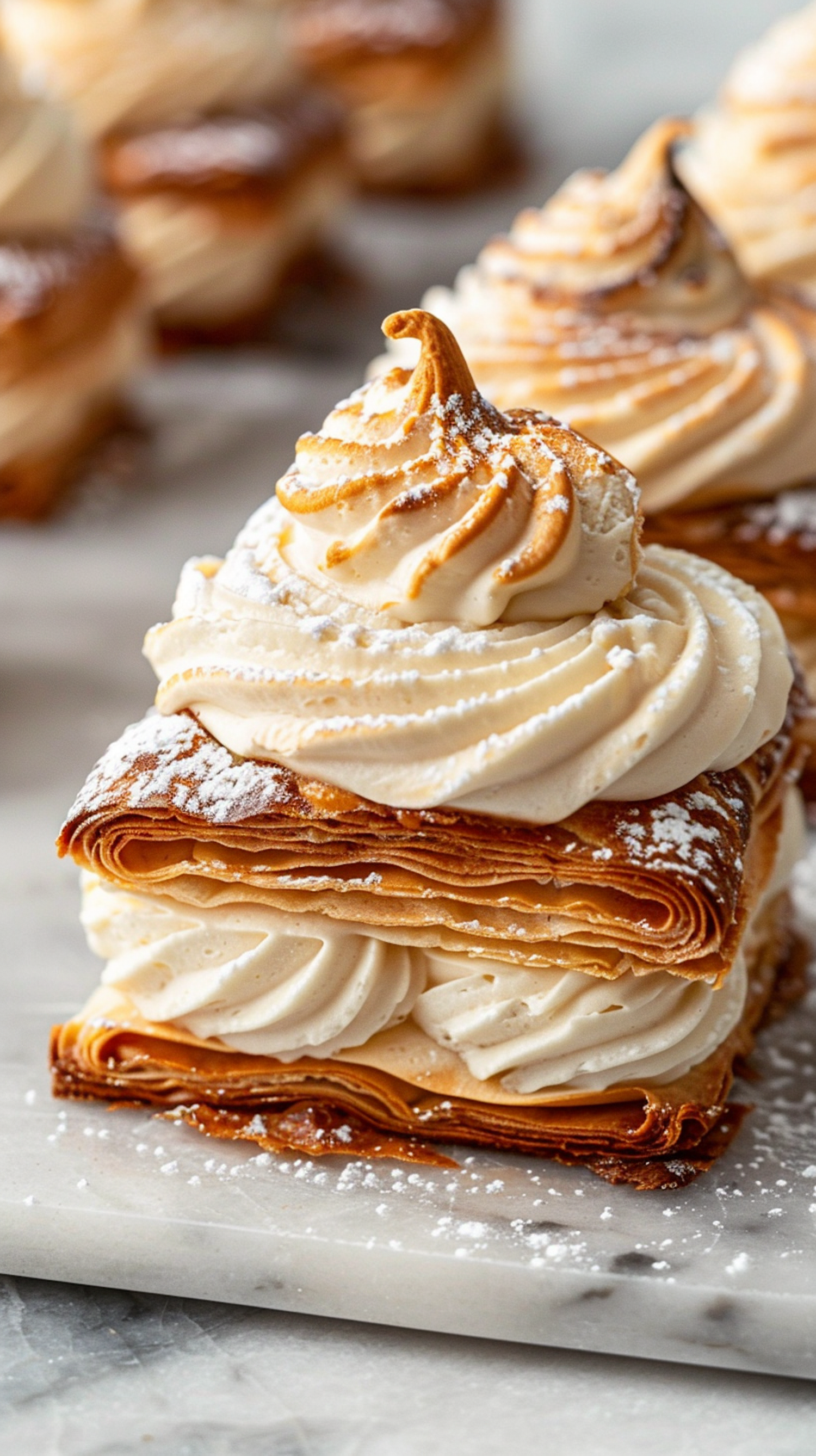 Delicious layered pastry with creamy swirls and a dusting of powdered sugar on a marble surface. Perfect for dessert lovers.
