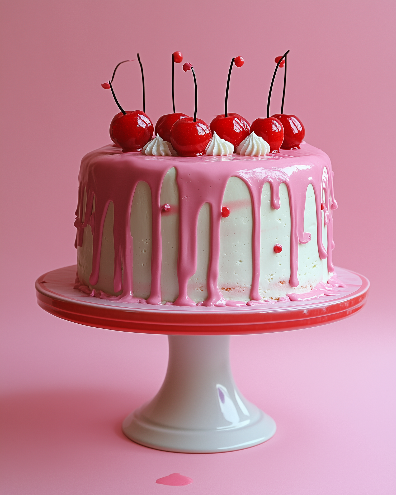 Elegant cake with pink glaze and cherries on a white stand against a pink background, perfect for celebrations.