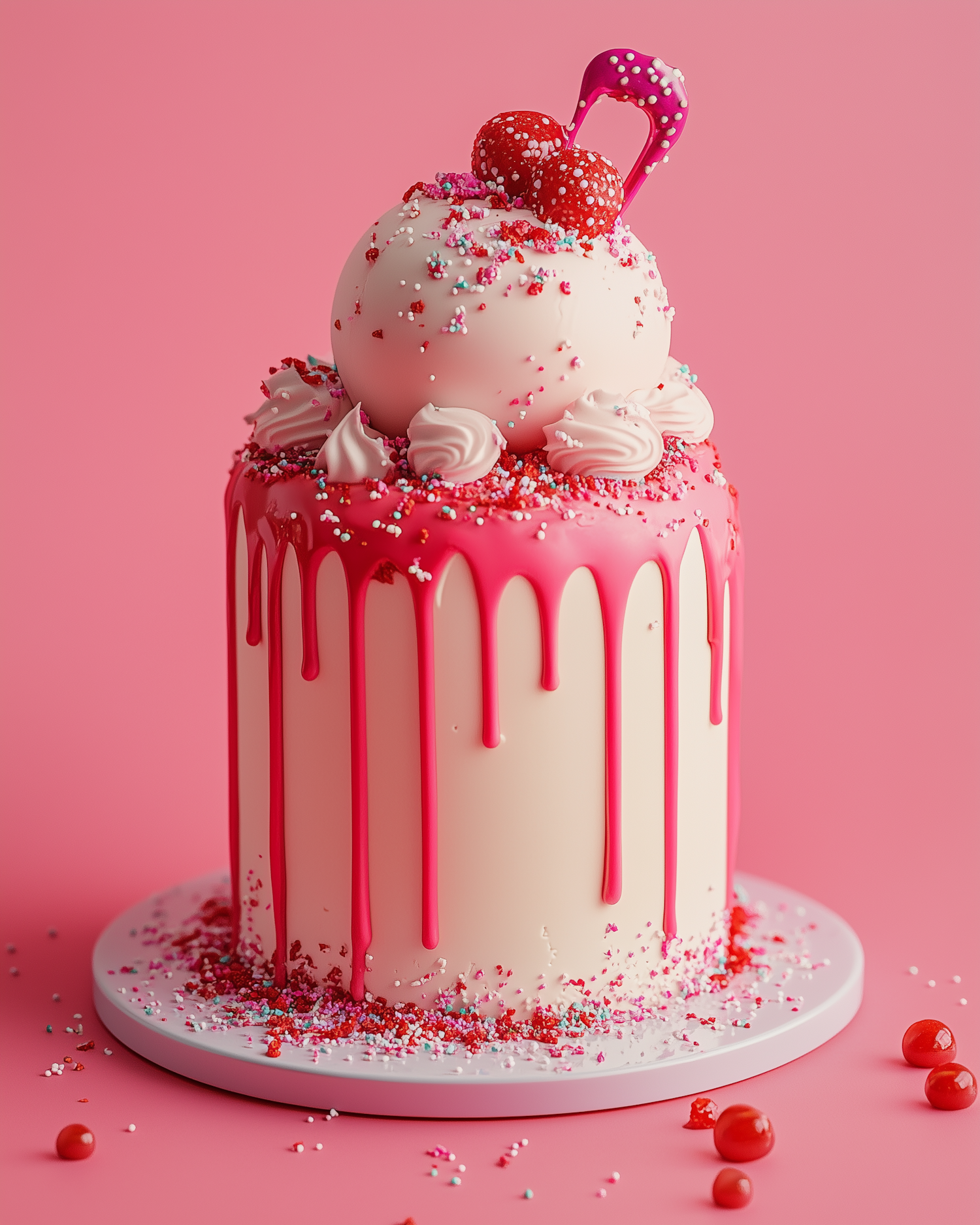 Elegant pink drip cake with sprinkles, strawberries, and a candy heart topper, perfect for celebrations or special occasions.