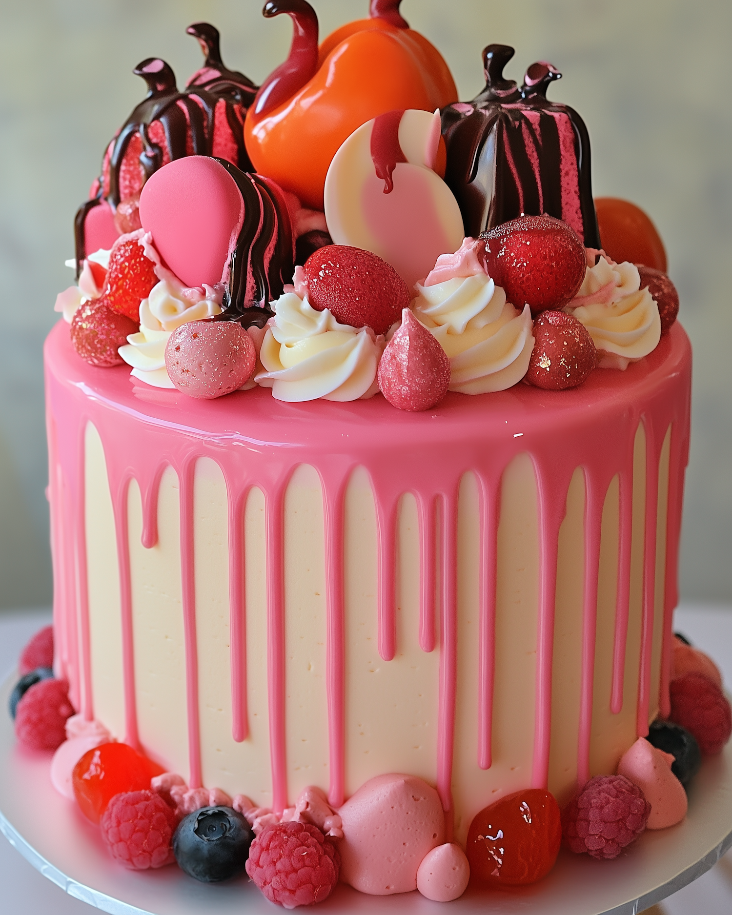Vibrant cake with pink glaze, chocolate, macarons, and fresh berries. A colorful and artistic dessert masterpiece.