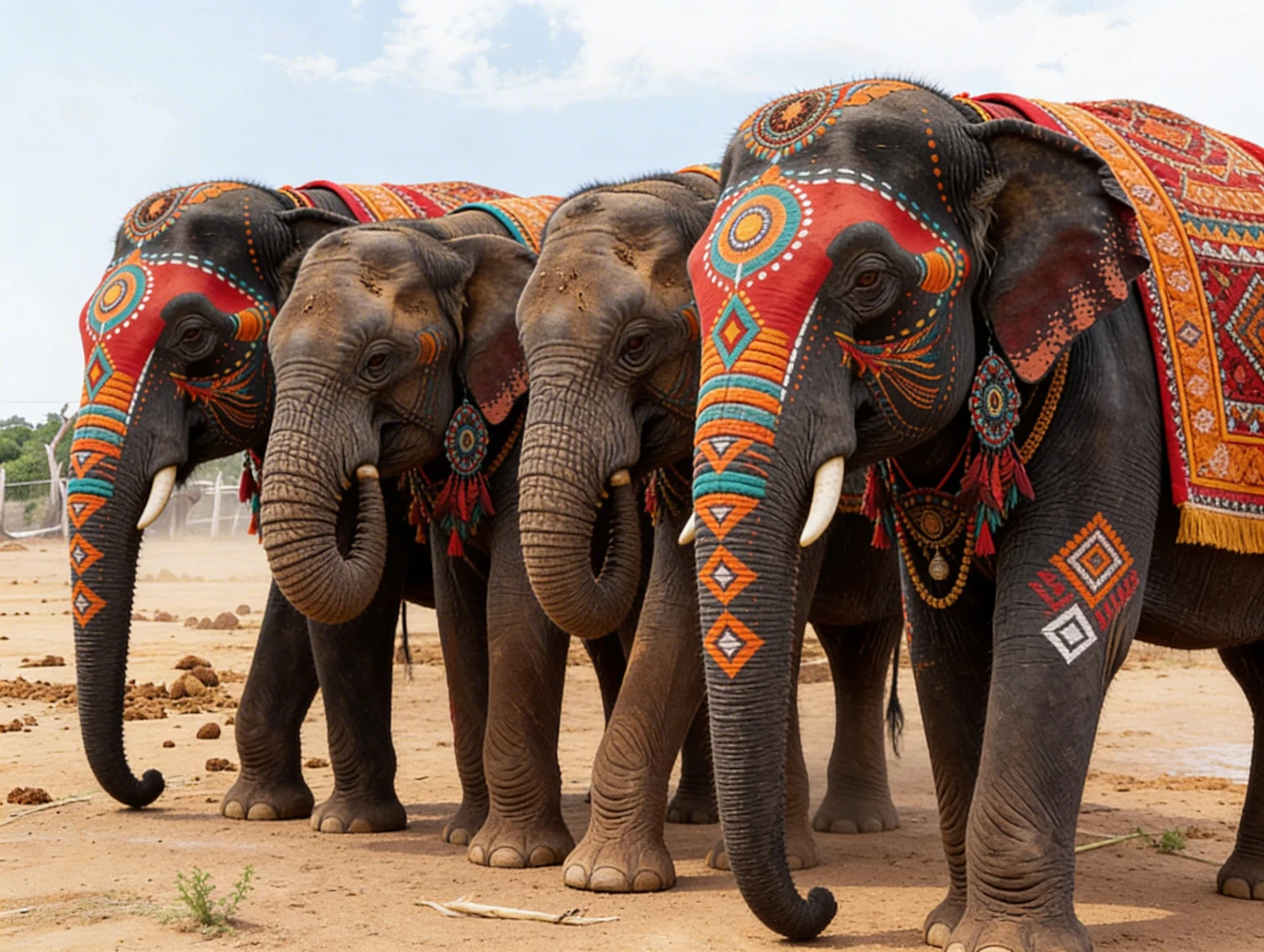 Four beautifully decorated elephants with colorful patterns and embroidered cloths stand together in a sandy outdoor setting.
