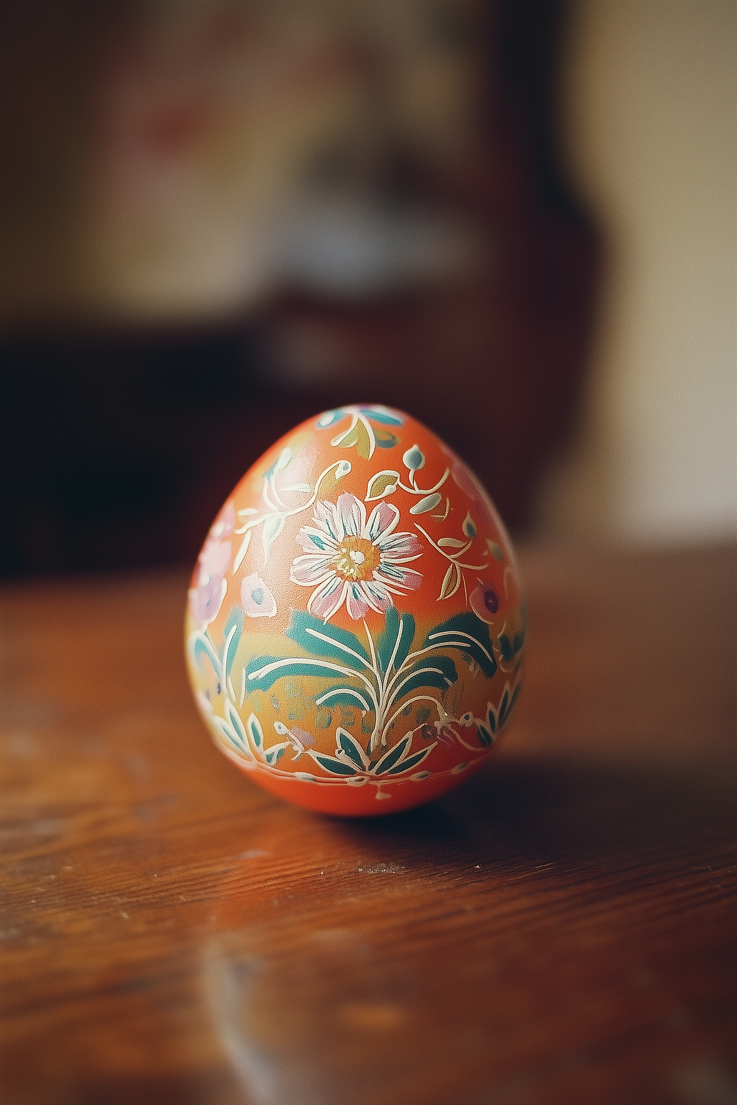 Intricately decorated orange egg with floral patterns on a wooden surface, showcasing traditional craftsmanship.