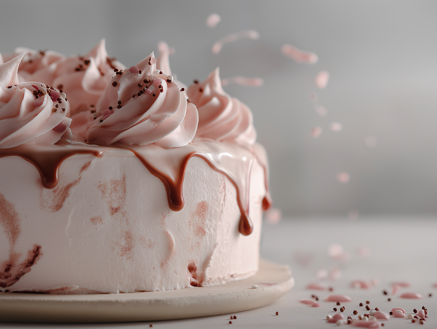 Delightful pink frosted cake with chocolate drizzle and whipped cream swirls, perfect for celebrations or dessert lovers.