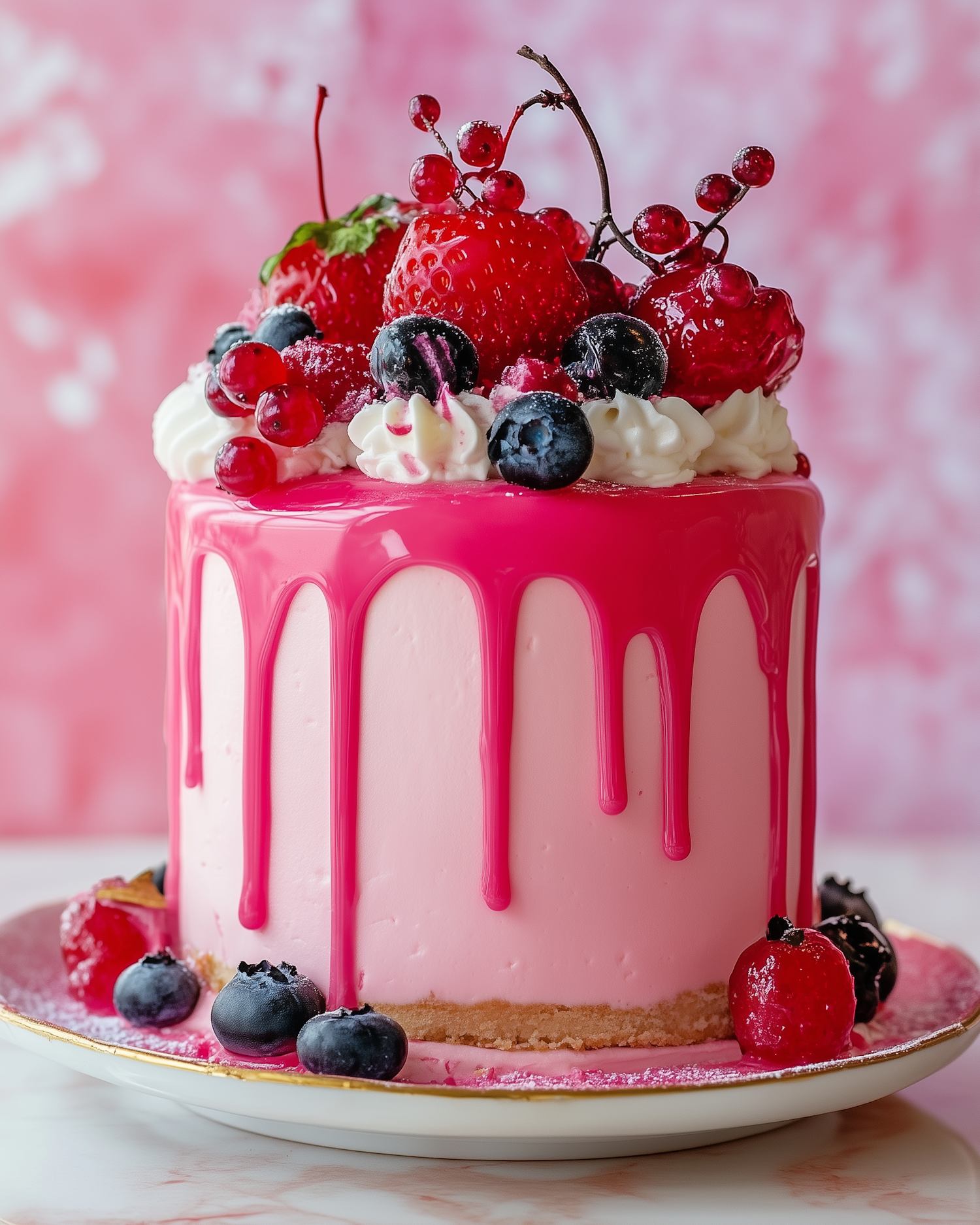 Elegant pink cake with glossy drip and fresh berries on top, set against a soft pink background. Perfect for celebrations.