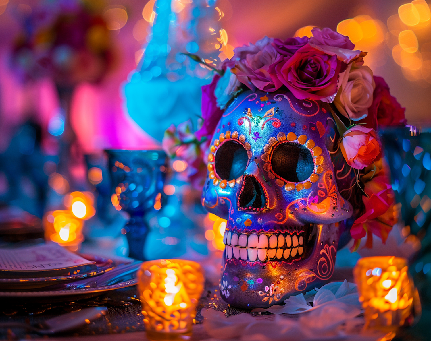 Colorful sugar skull with roses and candles, perfect for Day of the Dead celebrations. Vibrant hues and festive atmosphere.