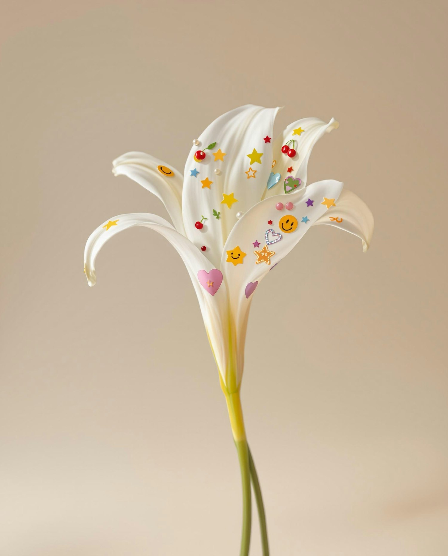 Photographed in a minimal studio setting, soft shadows and gentle lighting, neutral gradient background, sharp focus, poetic and surreal aesthetic. The flower is adorned with unexpected decorative elements (pearls, crystals, painted patterns) to create a refined and artistic look. Editorial style, high resolution, ultra realistic details, artistic direction similar to luxury floral photography. Side view of a white lily, with playful, colorful stickers applied on the petals — including smiley faces, stars, cherries, and retro hearts. The juxtaposition of elegant form and naïve stickers creates a pop-sentimental, nostalgic vibe.