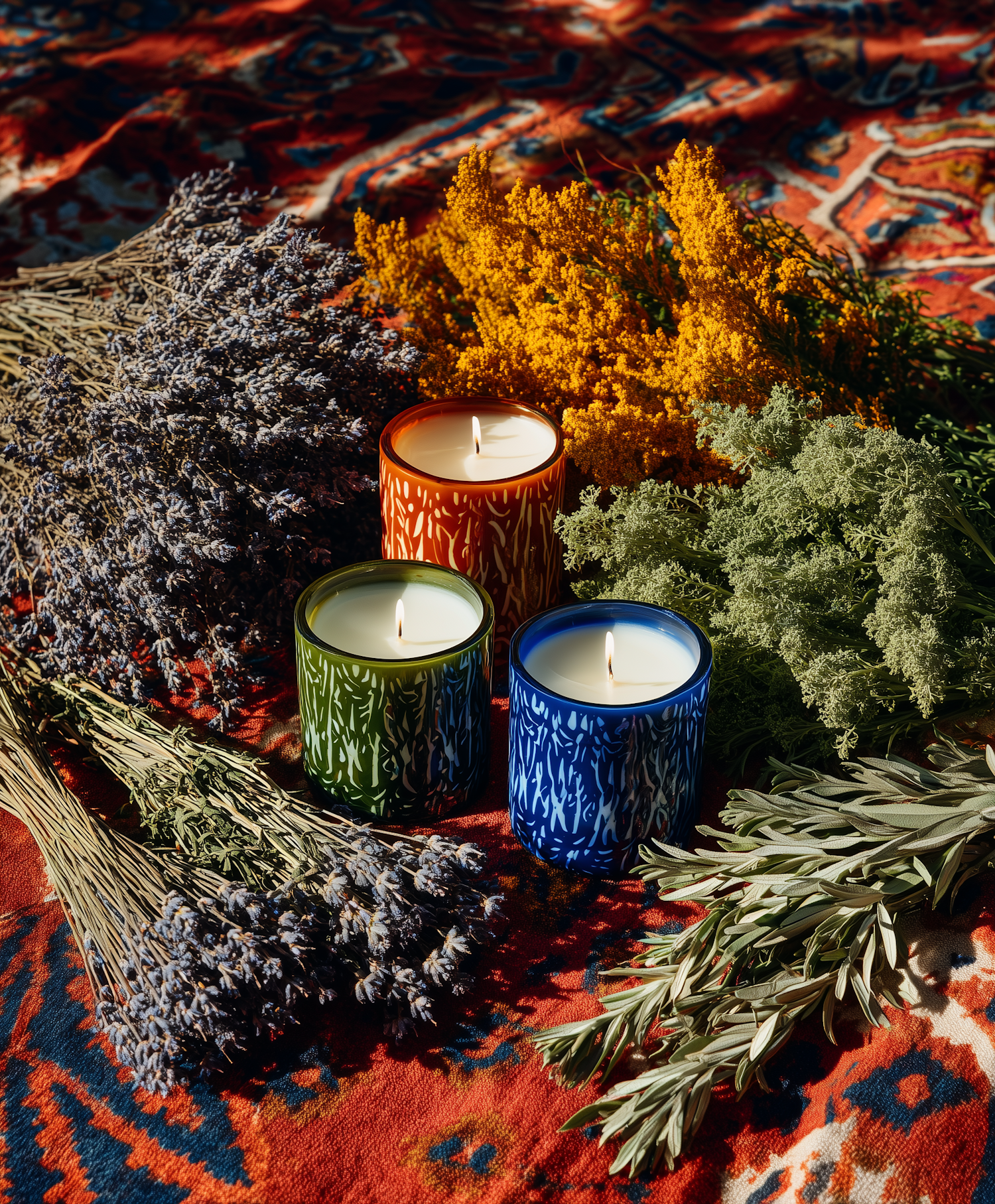 Colorful candles surrounded by dried herbs on a vibrant patterned fabric, creating a cozy and aromatic ambiance.