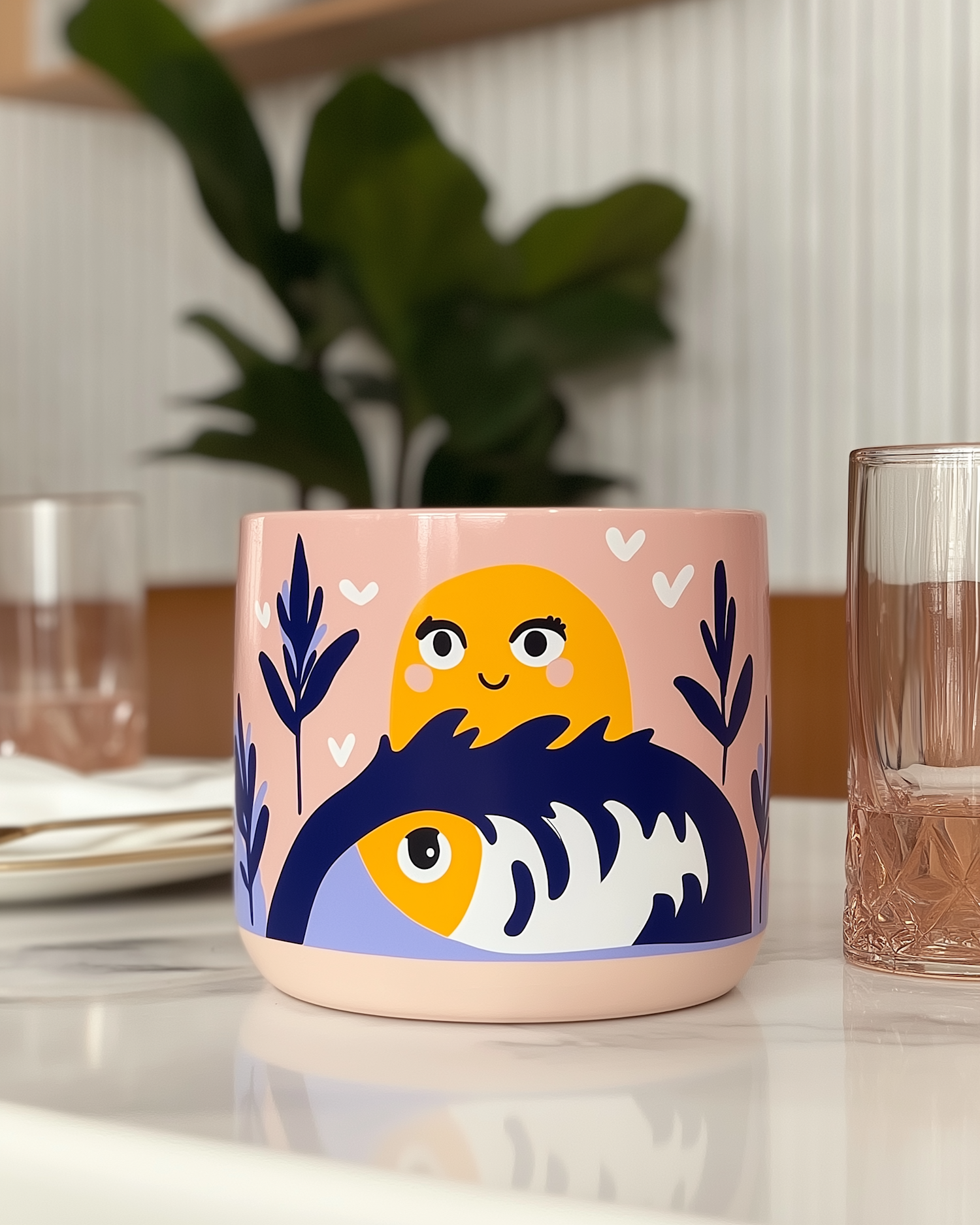 Colorful ceramic pot with whimsical sun and wave design on a pink background, set on a marble surface with glass and plate nearby.