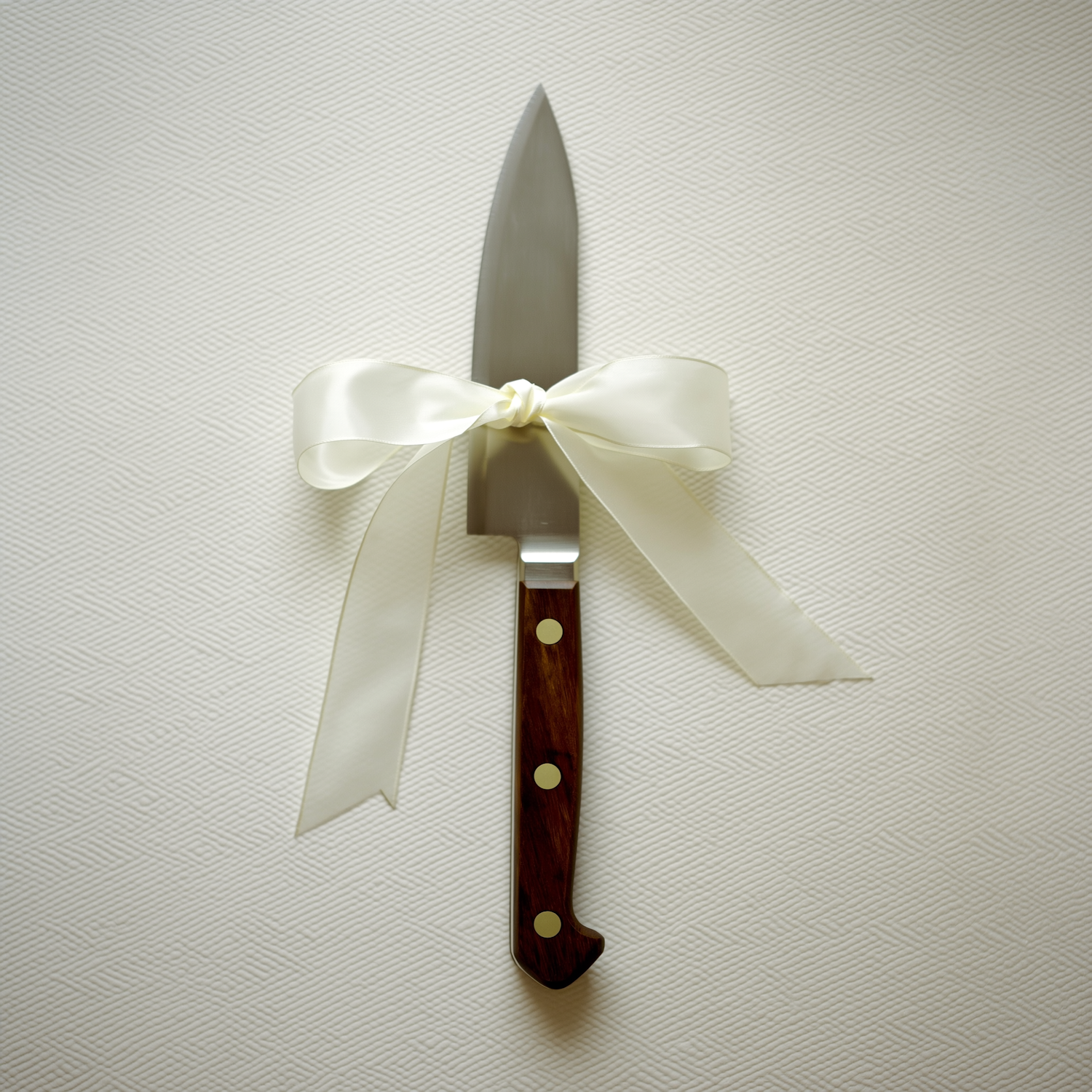 A chef's knife with a wooden handle tied with a white ribbon bow, placed on a textured white background.