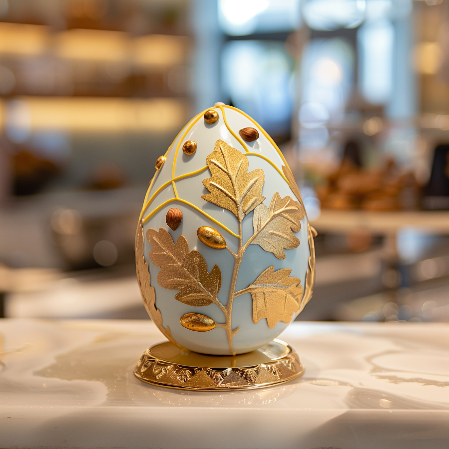 Elegant decorative egg with golden leaves and acorns on a smooth surface, exuding luxury and sophistication.