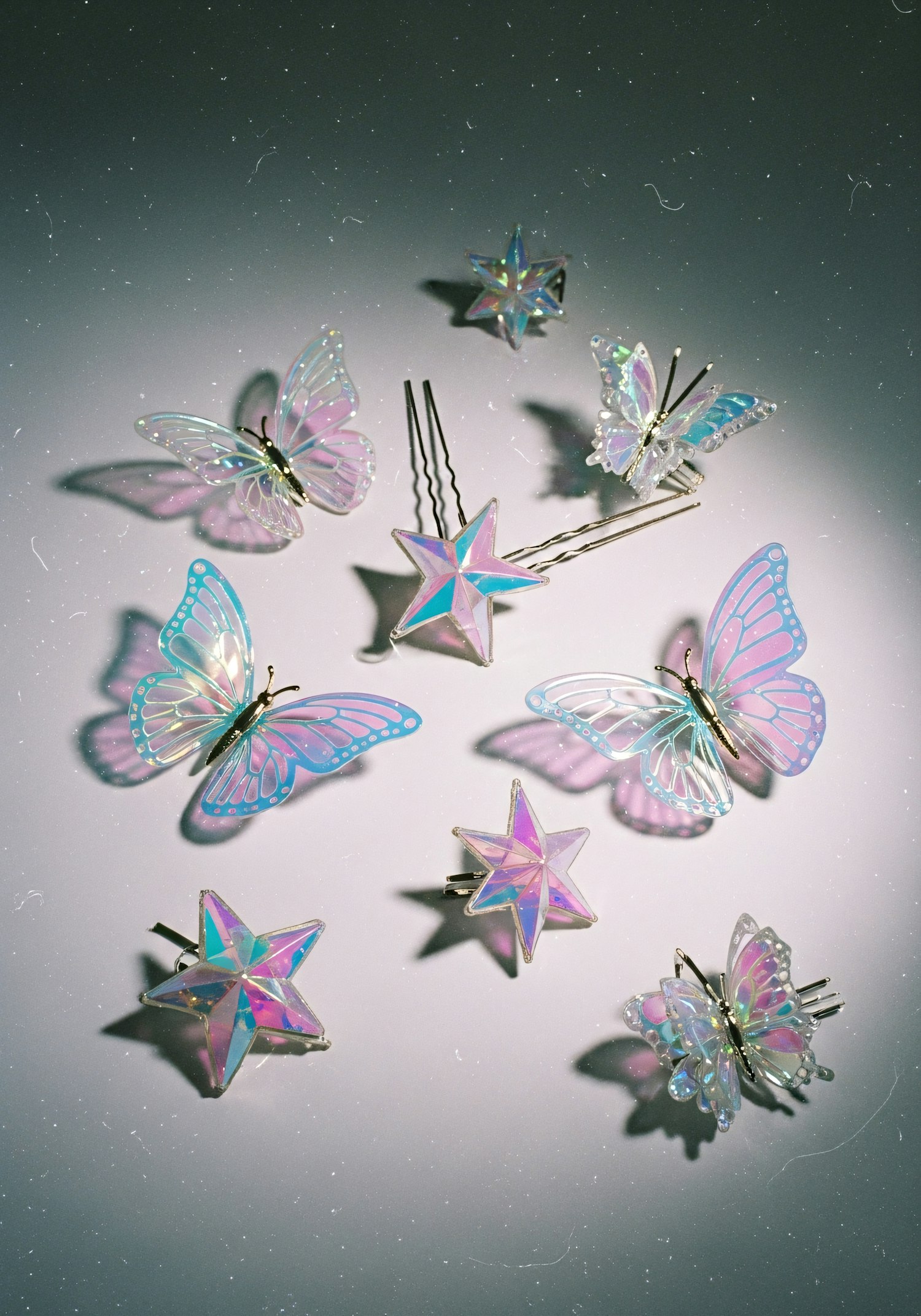 A collection of iridescent butterfly and star hair accessories on a smooth surface, reflecting light in pink, blue, and purple hues.