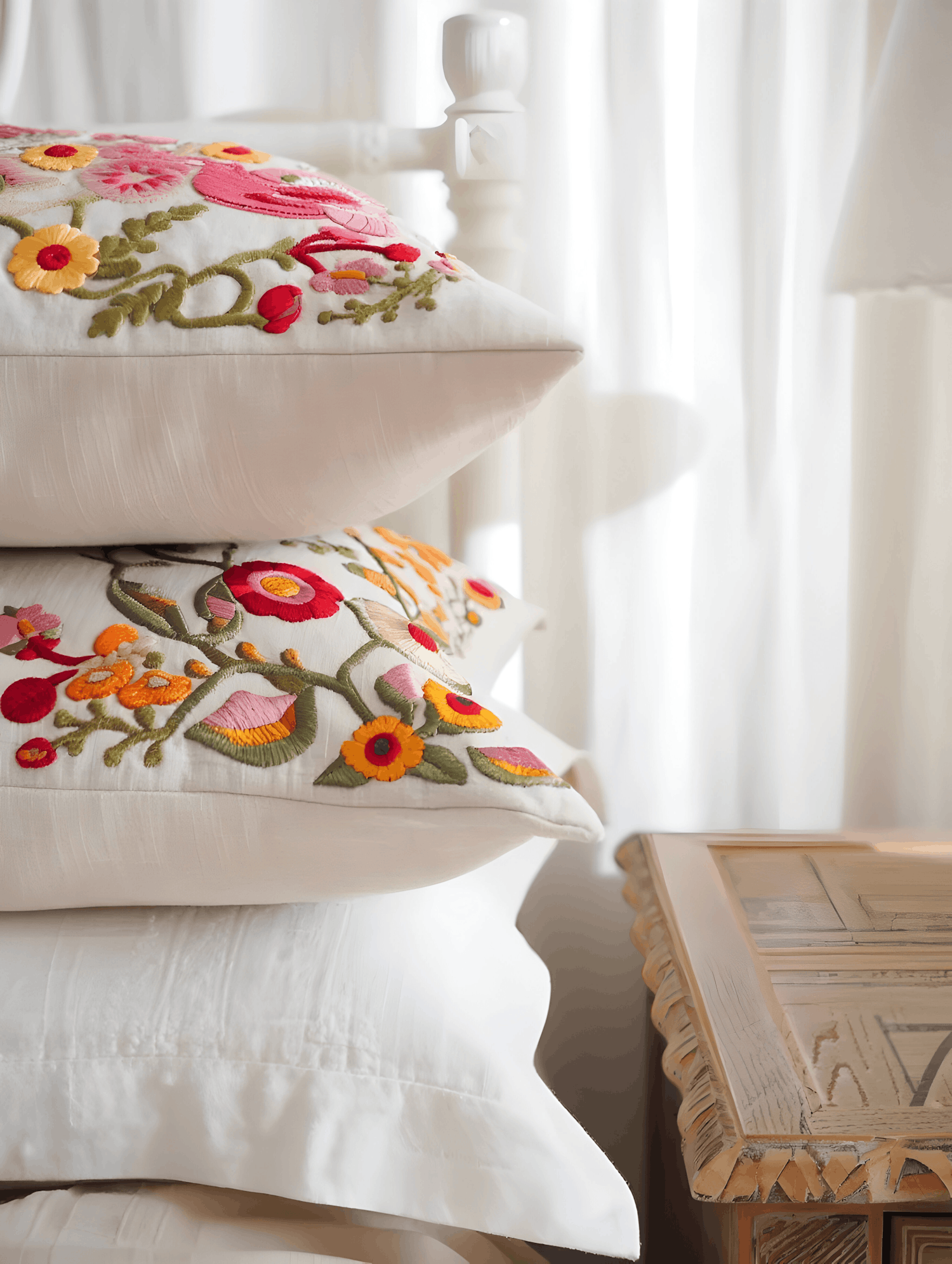 Stacked embroidered floral pillows on a white bed, with soft natural light and a carved wooden side table adding a cozy touch.
