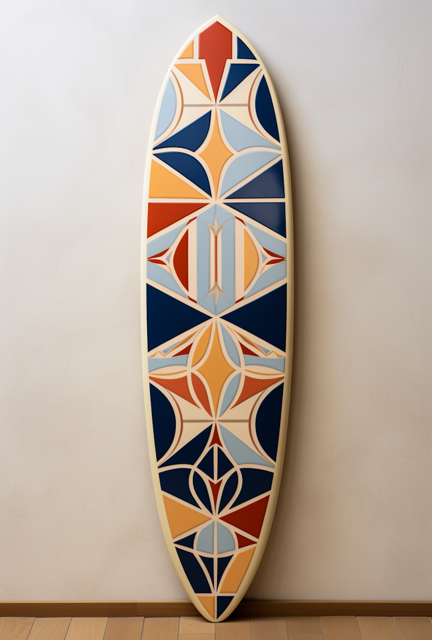 Vibrant surfboard with geometric stained glass design in blue, orange, and red against a plain wall. Perfect for art and surf enthusiasts.