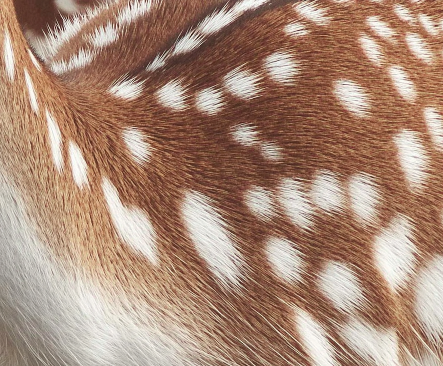 Close-up of a deer's fur with a rich brown color and white spots, showcasing the intricate texture and natural pattern of the coat.