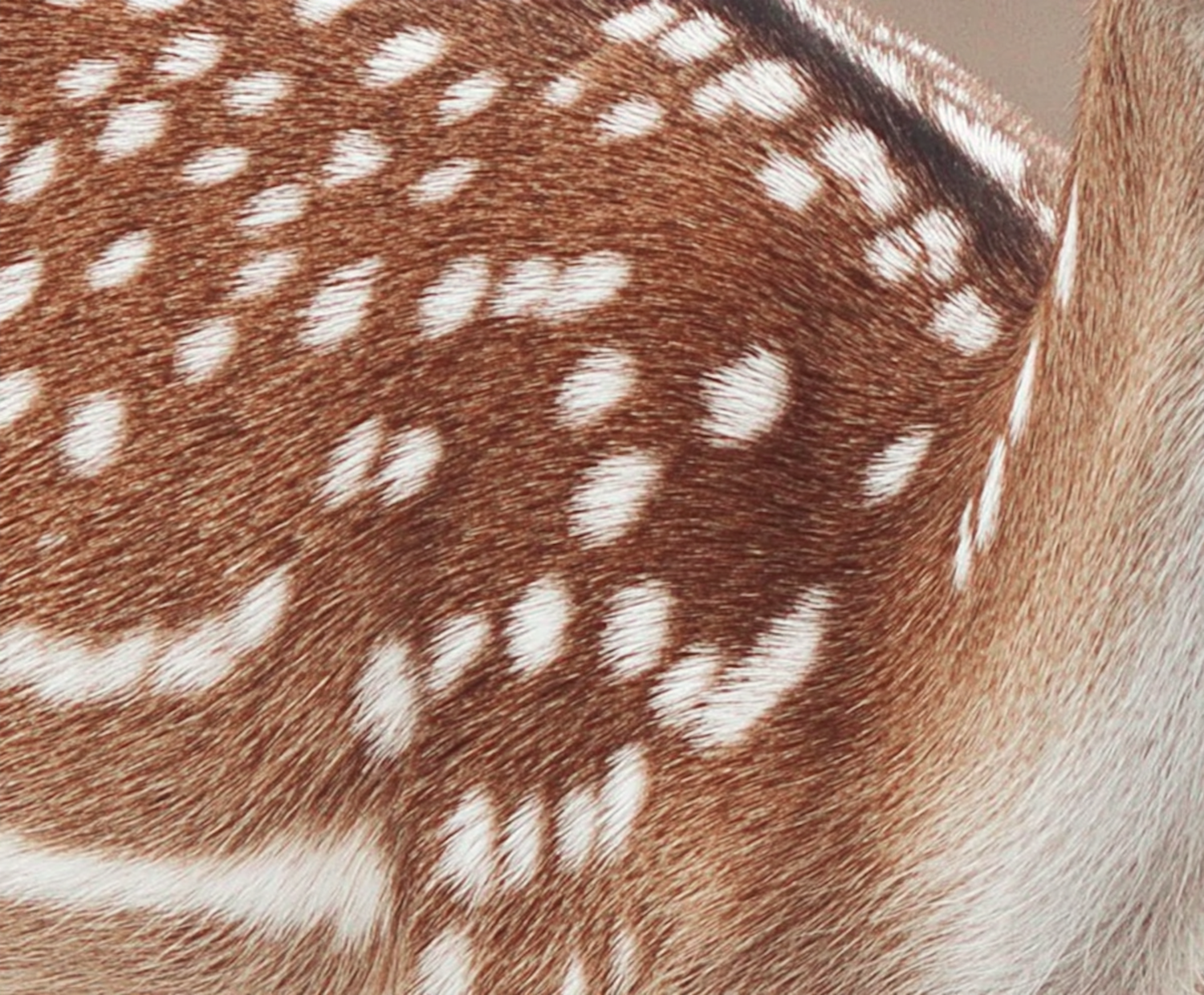 Close-up of a deer's fur with a rich brown color and white spots, showcasing the natural texture and pattern of the animal's coat.