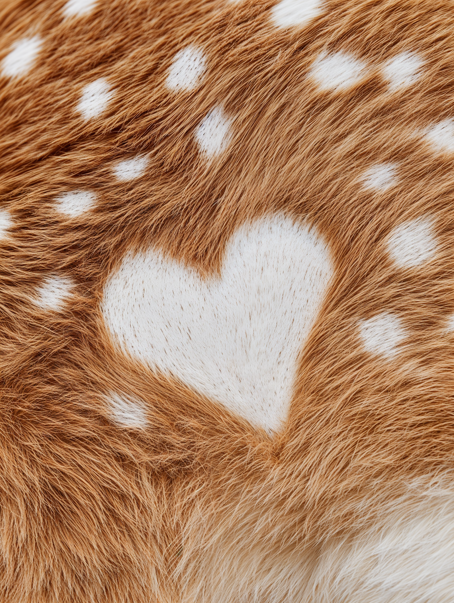 Close-up of a deer’s fur with a heart-shaped white patch surrounded by smaller white spots on warm brown fur. Nature's unique design.