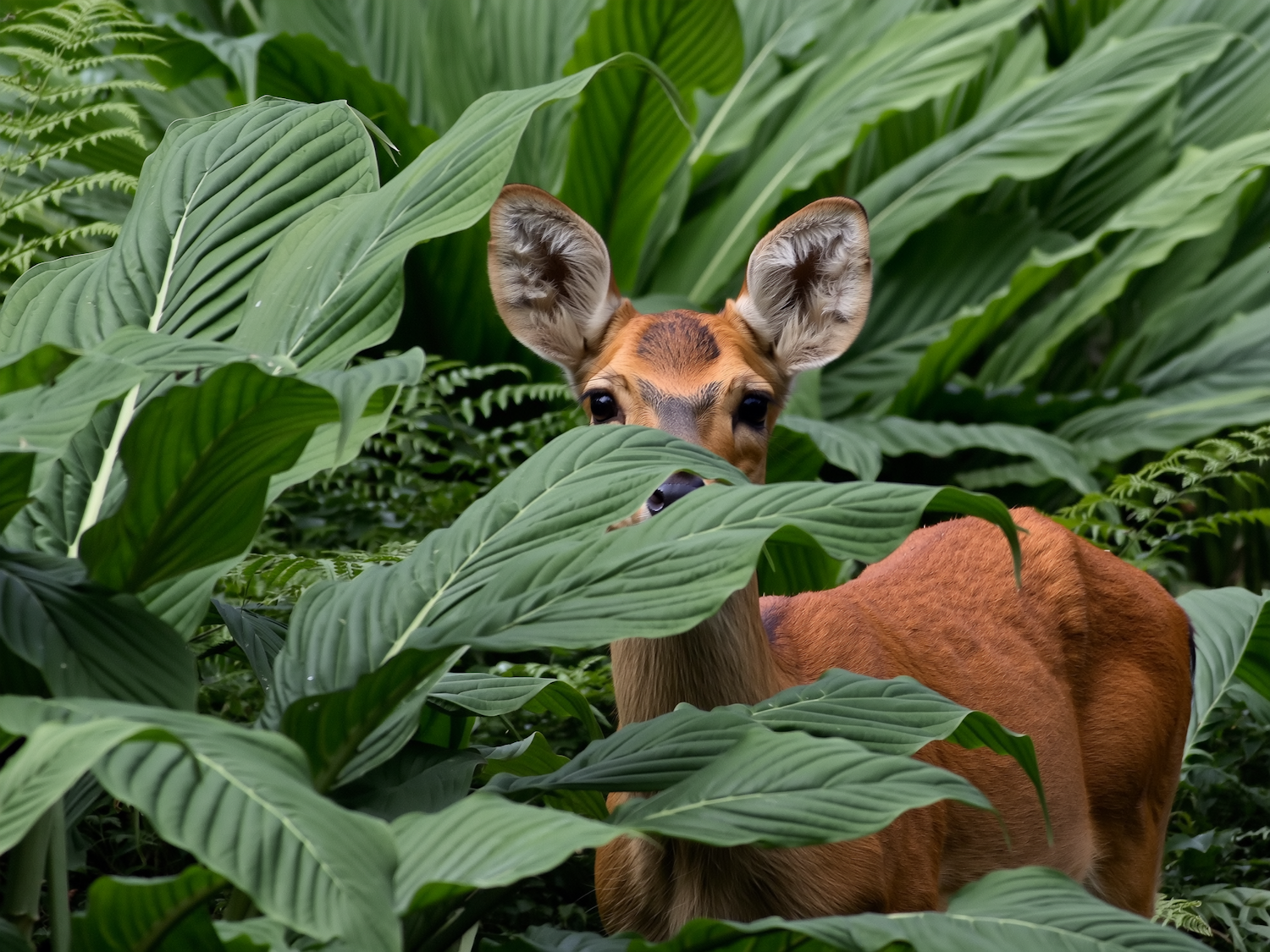 A curious young deer peeks through lush green foliage, creating a serene and natural scene with vibrant greenery and soft lighting.